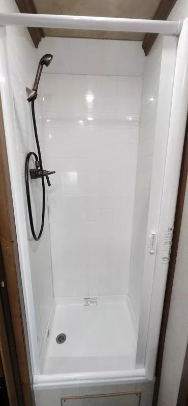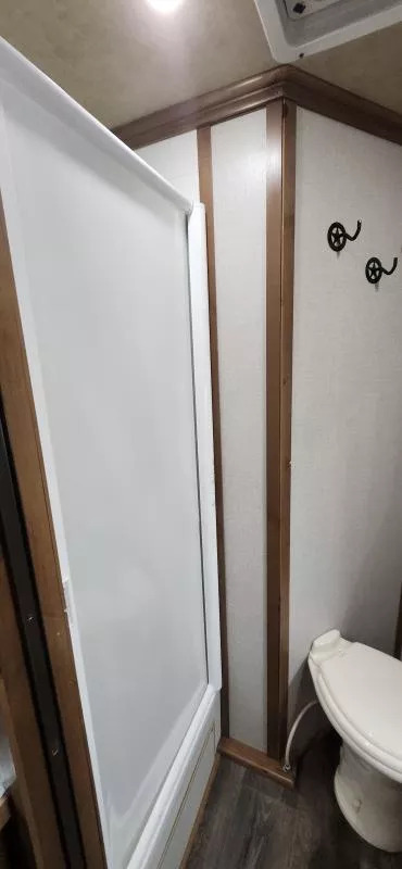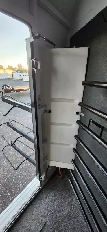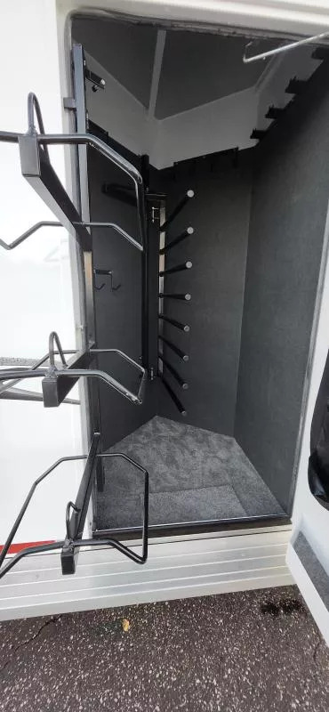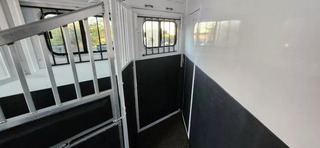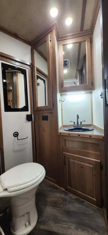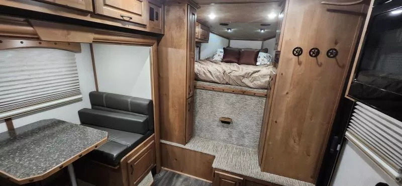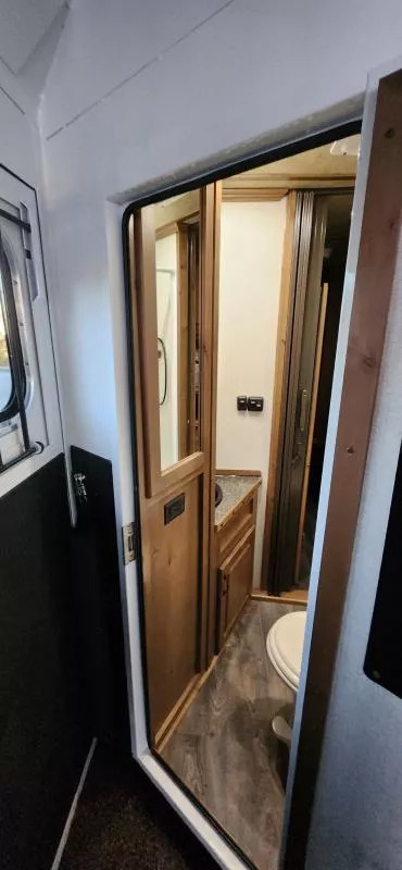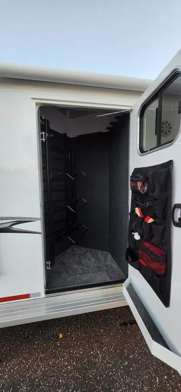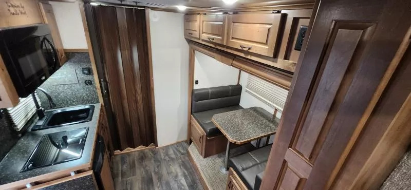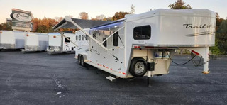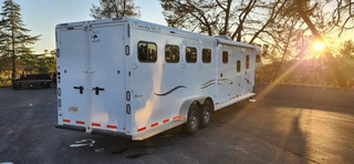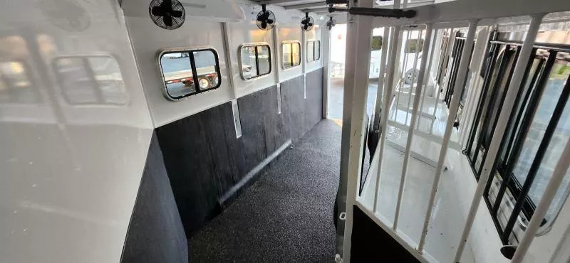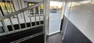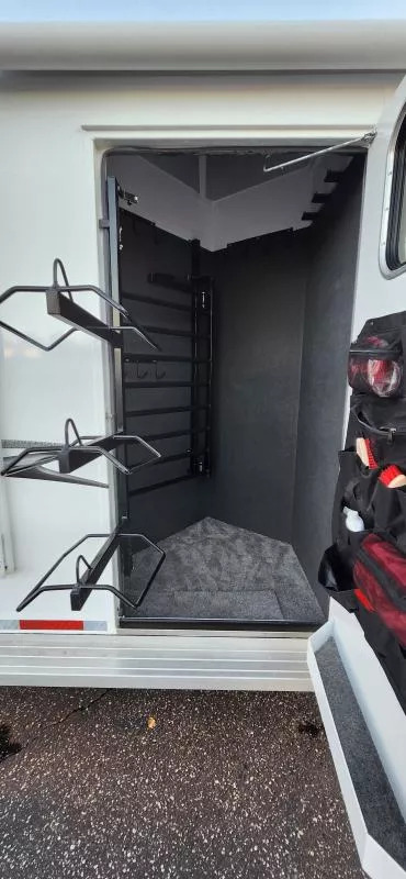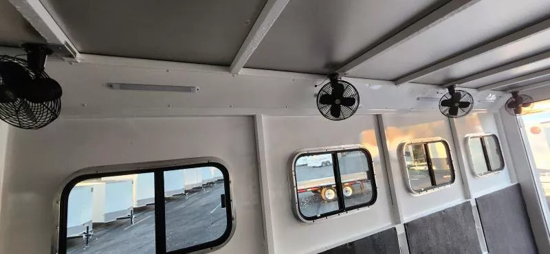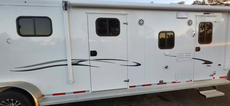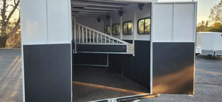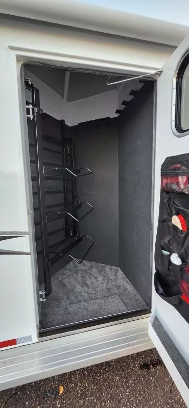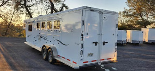 Horse Area Features: Electric fans for each horse stall - for ventilation and comfort. Mangers - for feeding/storage. Drop-down windows - for airflow and visibility. Escape door in stall area - for safety. Walk-thru door - access between horse area and living quarters. Living Quarters Features Dinette that folds out to bed - space-saving sleeping area. A/C and Furnace - climate control. Electric Awning with LED lighting - outdoor shade and ambiance. Outside water access - for cleaning or watering. Outside 110v outlets - for powering external devices. Plenty of cabinetry - storage space. Tack Features: Mid tack with swing-out saddle rack - organized tack storage. Swing-out blanket rack - easy access to blankets. Water tank - for horses or living quarters. Bluetooth radio - entertainment and connectivity.