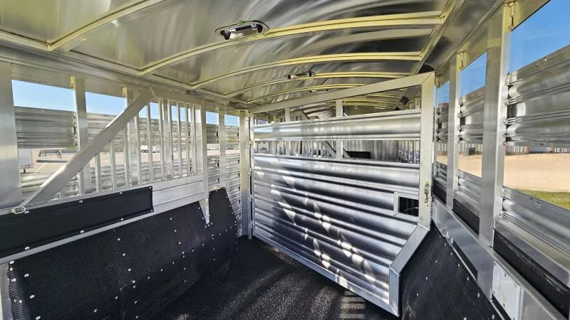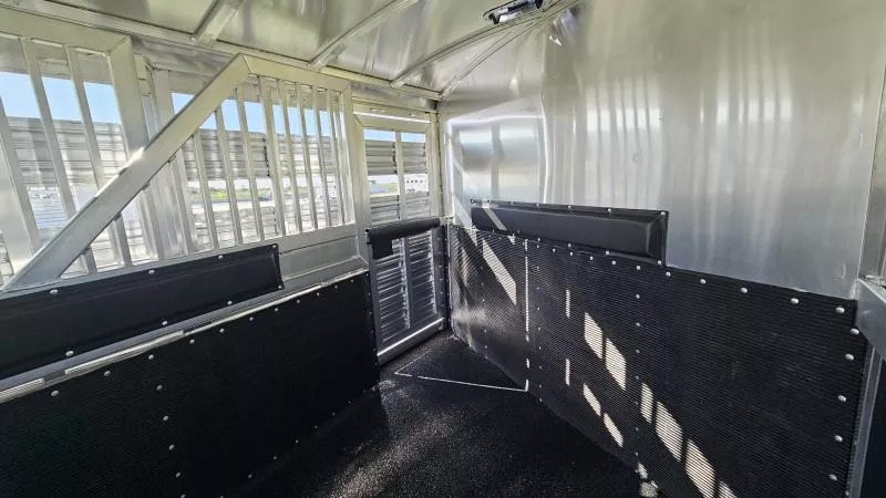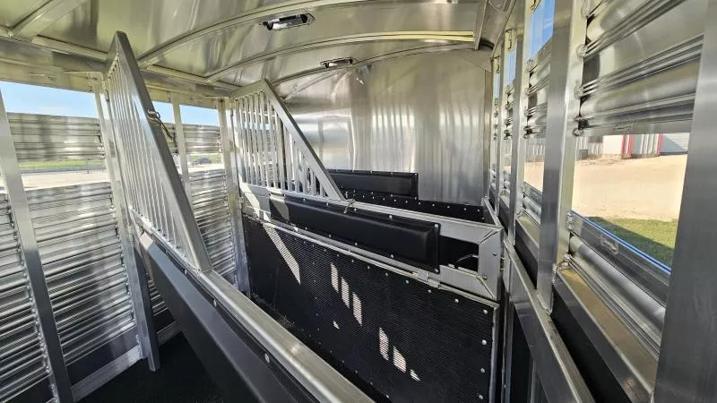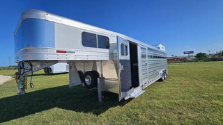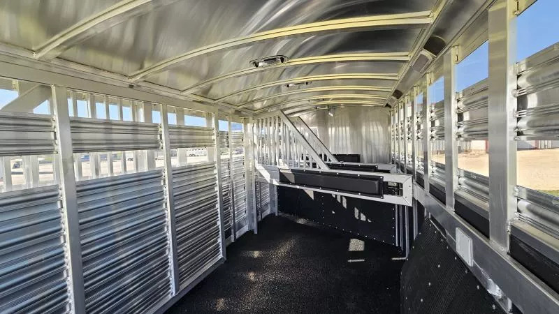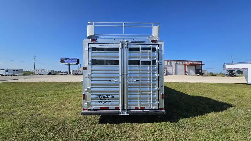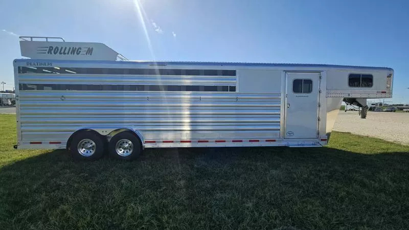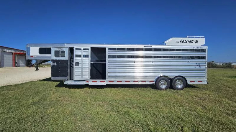 2026 Platinum 5-Horse Stock Combo - Premium 8’ x 26’ x 7’ Polished Aluminum Trailer Location: Rolling M Trailers - 11495 N IH-35, Jarrell, TX 76537 Call us at 512-746-2515! *Financing and Nationwide Delivery Available* *** Built for Professionals Who Demand More When you’re hauling valuable horses or livestock, every detail matters. This 2026 Platinum 5-Horse Stock Combo is engineered to handle the miles, the load, and the lifestyle-whether you’re rodeoing every weekend or managing a busy ranch. *** Specifications * Dimensions: 8’ W x 26’ L x 7’ H * Axles: (2) 7,000 lb rubber torsion with 2” block-down * Coupler: 2-5/16” adjustable gooseneck * Tires/Wheels: Hankook ST235 / 85R16 TH31 *** Standout Features * Werm Flooring: Protects your trailer floor, adding value and longevity to your investment. * True Multi-Purpose Layout: 5-horse/stock combo with custom gates for flexible loading * Effortless Access: Flow-thru fold-up aluminum steps at every entry point * Premium Look & Strength: Stainless steel tapered nose with reinforced flooring * Spacious Dressing Room: Tack doors on both sides, carpeted bulkhead, covered saddle rack, and clothes rod * Efficient Ventilation: Plexiglass on all sides plus pop-up vents above each stall area * Ready for the Road: 6’ hayrack with ladder, brush trays, blanket bars, and inside/outside tie rings *** Lighting & Safety * Bright long LED loading lights (rear, curbside, streetside) * Extra clearance and 1” round LED running lights Designed for the Long Haul This trailer isn’t just about getting from Point A to Point B-it’s about doing it with confidence. From the 40-gallon dressing room water tank to the removable baby panel with rubber on both sides and rubber-lined walls, every feature is built to make hauling safer, easier, and more comfortable for your animals. *** Why Choose Platinum? Platinum builds some of the most reliable stock combo trailers on the road, and this one is no exception-reinforced where it matters, equipped with thoughtful upgrades, and backed by Rolling M’s reputation for premium trailer sales and nationwide service.
