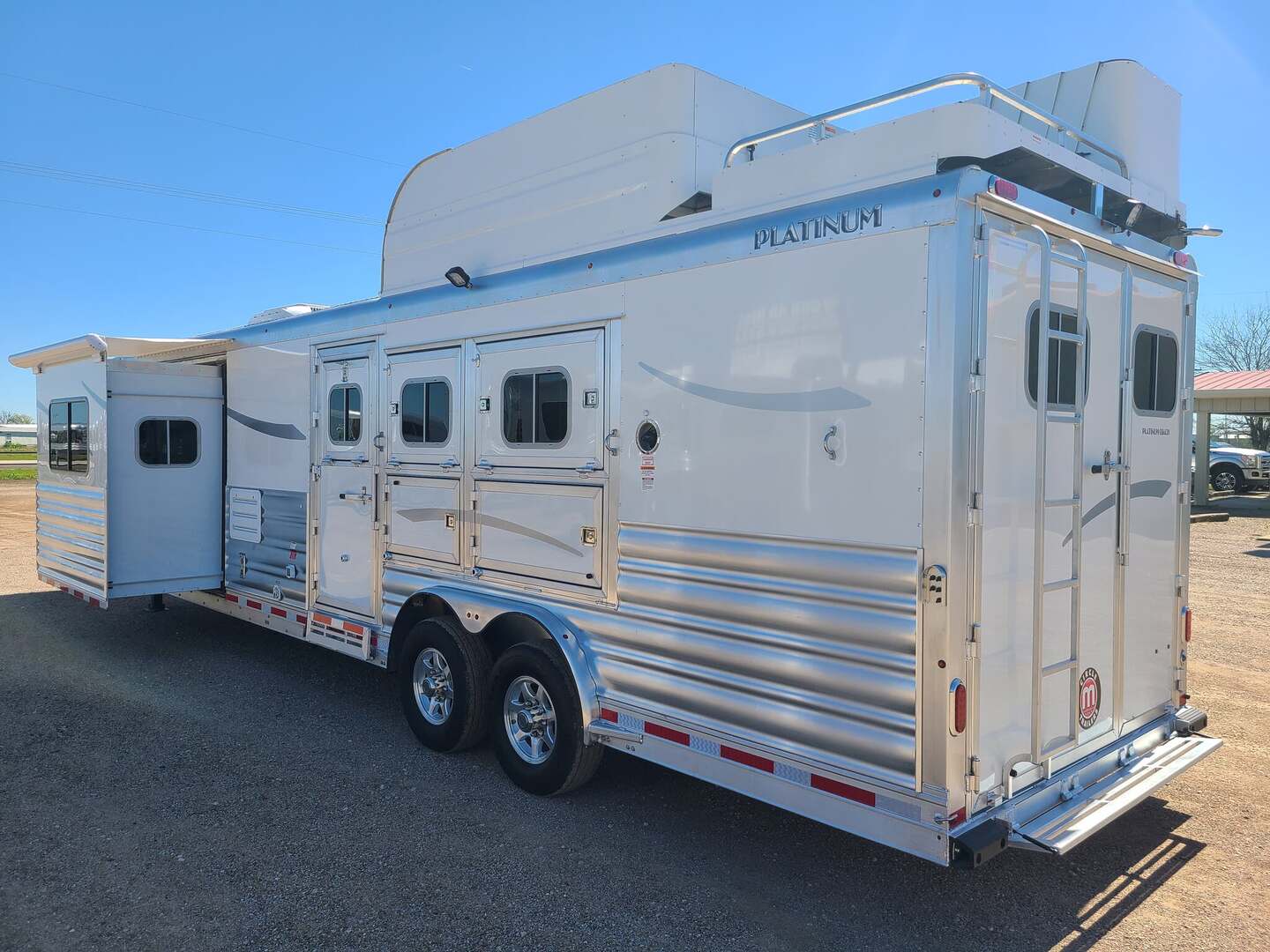 Platinum Coach 3 horse with 14’ Short wall Proline XP by Outlaw Conversions interior SLIDE OUT with 72” Sofa Sleeper and Corner Bench with SIDE LOAD Platinum Coach features: 8 wide x 30’ long x 7’6” tall 70/30 Rear Doors & SIDE LOAD 2 mangers with escape door at head Drop down window bars on head side Drop down windows on curb side 6’ hay pod & ladder 24” walk through door Baby panel on first divider Flow through and swing back dividers 2” Blocked axles for additional ground clearance 3 outside LED load lights 3 tier saddle rack, surrounded by 30 hooks!! 4 tier swing out blanket bar Flow through style steps 8,000# axles with 14 ply Goodyear tires on Aluminum Wheels Proline XP by Outlaw Conversion Features: 14’ short wall 72” Dinette in 6’ slide out Corner bench at drop wall Dual-Hydraulic Jacks Ebony Alder Brio cabinetry Wardrobe with mirrors in nose Onan 4.0 MicroQuiet generator on Platform 15,000 BTU A/C with heat strip 20,000 BTU furnace Electric power awning...NICE!!! 6 gallon hot water heater with Propane heat 60 gallon water tank AM/FM/CD/DVD player with 2 interior and 2 exterior speakers 32” LED Smart TV over fridge on door with locking arm Double Almond kitchen sink &  silver faucet 2 Hardwood hat racks over R/V door 6.0 refrigerator Glass cover 2 Burner cooktop Microwave oven with vent hood Extra wide pocket door to bathroom 32” radius shower w/ silver glass door & vent overhead Porcelain toilet with foot flush Mirror next to walk through door