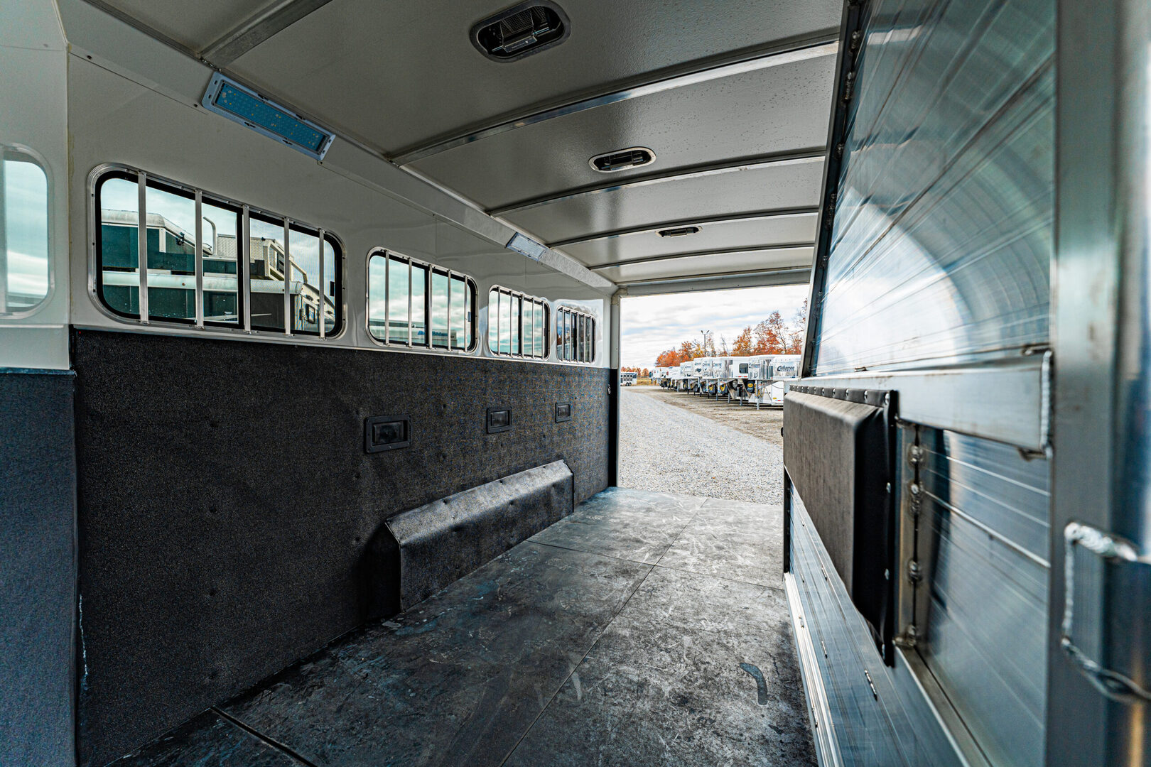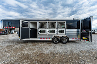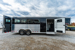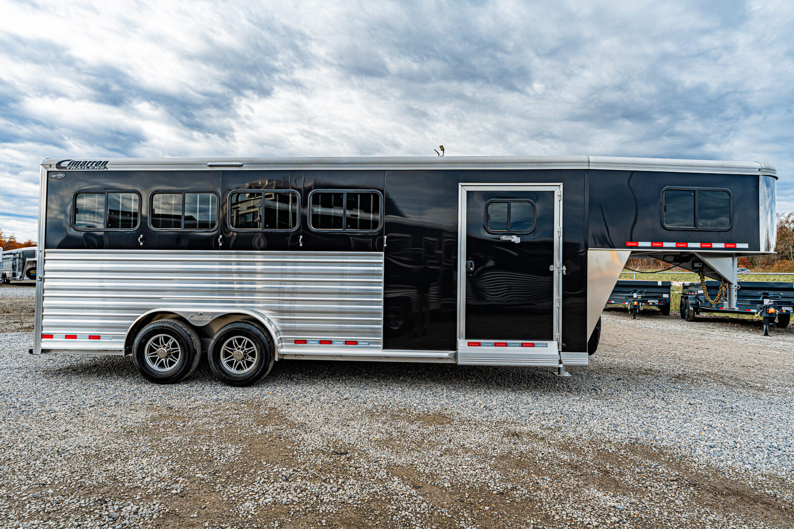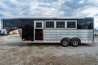 2026 New Cimarron Norstar gooseneck stock trailer. Drive train 7,000# Dexter torsion axles -extruded side slats at stall area, lower body running boards are full length, led awning lights, solid partition wall, full height and width of front tack wall, primary door front tack room door 42’’ wide, carpet floor, GN wall and GN deck, sliding type of windows for front tack, swing around doors above in stall area, head side fold down type with safety bars feed doors, full center gate -bars above, , 2 partial dividers, swinging solid type for head grills, dome lights, adjustable saddle rack, added recessed paddle latch on side access door, window slider 19x34 in stall area, -in partition wall 54’’ from floor, centered, extra divider location, straight load to move both dividers to LH side wall. Call for more details!!