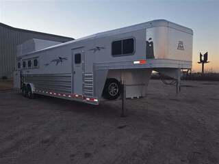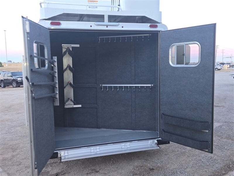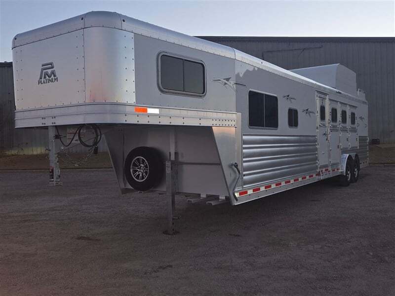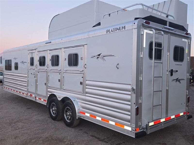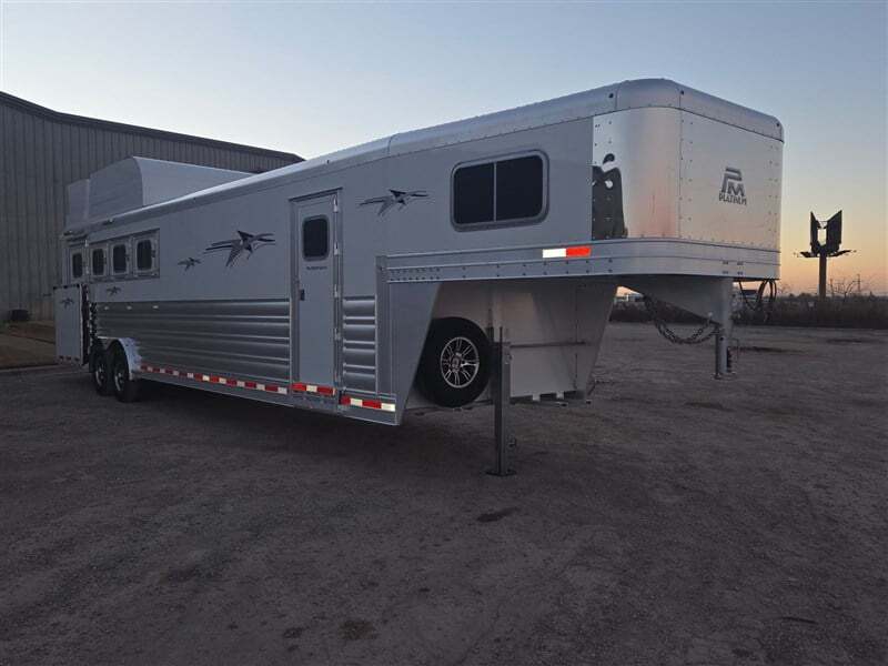 ON ORDER...COMING FEBRUARY 2026...HUGE YEAR END DISCOUNT...$34,012.40 OFF MSRP 2026 PLATINUM 4H REAR SIDE LOAD WITH 12’8” SHORT WALL OUTLAW CONVERSIONS PROLINE XP LQ SOFA...DINETTE...FOLD DOWN BUNK...HYDRAULIC JACK...HAYPOD 8’ Wide x 32’ Long x 7’6” Tall LIVING QUARTERS FEATURES: 5 YEAR CRAFTSMANSHIP WARRANTY Onan 4.0 Microquite Gas Generator Sofa sleeper Dinette with removable table Power awning with metal weather shield and LED lights AM/FM Radio/CD/DVD (2) Interior and (2) exterior speakers (2) LED flat screen smart TVs 12v USB Cell phone outlets Lighted grab handle at LQ door Exterior porch light at LQ door Folding screen door Power roof vent with fan above shower Power vent hood above cooktop Full length mirror in wood frame 7.0 Cu ft LP/120v refrigerator Kitchen drawers 2-Burner recessed cooktop with flush mount glass cover Microwave ove 6 Gallon LP/120v water heater with electric start 60 Gallon fresh water tank Exterior water faucet under nose (2) 20 lb LP tanks with auto change over 15,000 BTU ducted air conditioner with heat strip 20,000 BTU ducted LP furnace Bathroom vanity with medicine cabinet and mirror 32” Radius shower with sliding door Day and night pleated window shades Snap cover over LQ door window Queen mattress Walk thru door from bathroom to stall area TRAILER FEATURES: Rear side load with full width rear tack (2) 8,000 lb Dexter  rubber torsion axles 4-Wheel electric brakes Axles blocked 3” to allow for greater clearance between truck bed and gooseneck (5) Hankook ST235/85R16 TH31 14 ply tires with 4,400 lb load capacity each and 81 mph speed rating (5) 16” 8 Hole aluminum wheels 12,000 lb Hydraulic jack WERM flooring in horse area and rear tack Horse area walls are lined, insulated and rubber lined Aluminum battery box Haypod with enclosed lid Generator compartment mounted on roof with platform Full width holdup rear step 50/50 Rear doors with lockable seal plate Stainless steel nose Round LED clearance lights Additional clearance lights on each top rail (3) LED exterior load lights (30) Bridle hooks (2) Brush trays (4) Saddle racks (4) Swing out blanket bars Full width rear tack sealed to roof and floor All walls carpeted in rear tack Flow thru dividers 1st stall divider is full bottom with flow thru bars  Bottom divider is rubber lined on both sides Rear divider is telescoping Escape door at head of 1st stall stall  Drop down feed door with separate drop down window bars at head of each stall Drop down door at rear of each stall Manger with exterior access door at 2nd, 3rd & 4th  stalls Fold up flow thru step at escape door and LQ door Camper door latch and butter fly latch at escape door MSRP: $184,007.40 Year End Discount: $34,012.40 SHININ’ B PRICE: $149,995.00 Financing Available with approved credit...Delivery Available