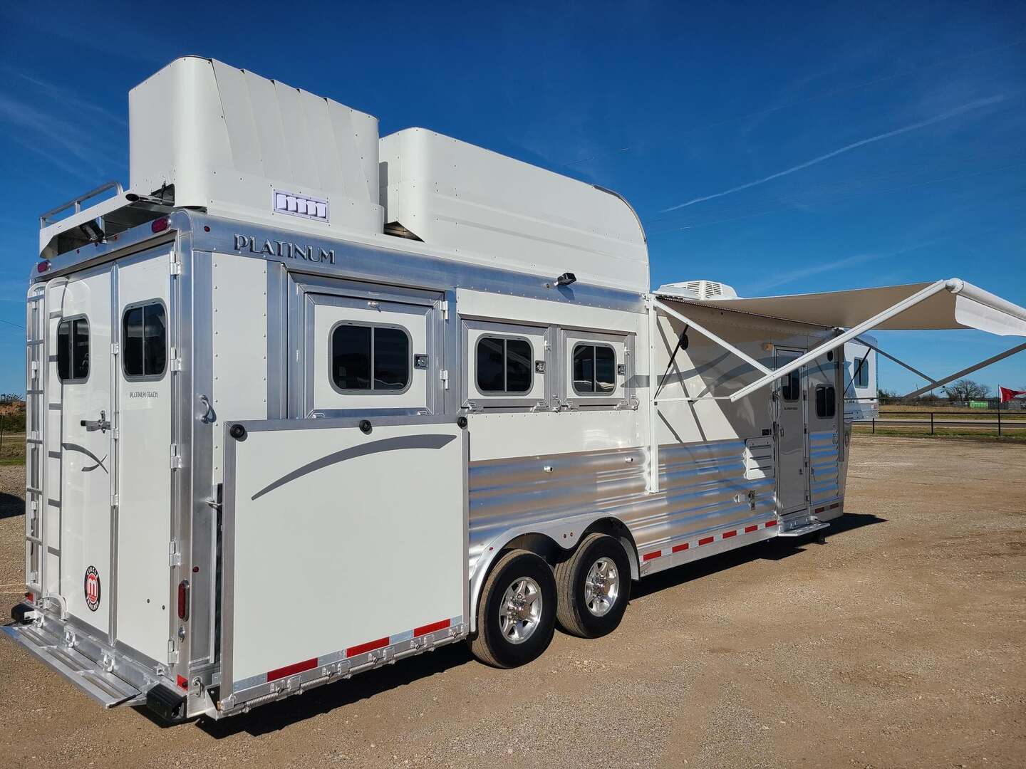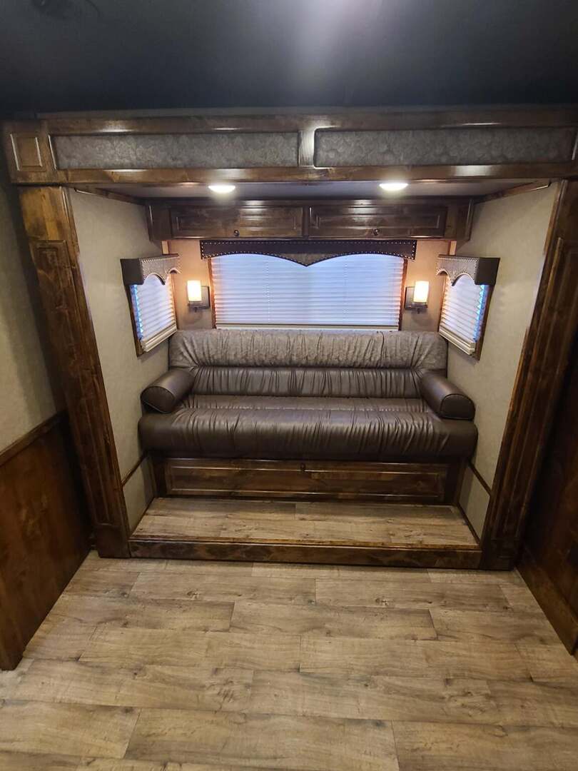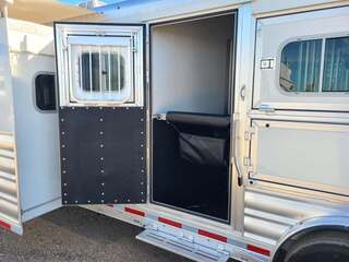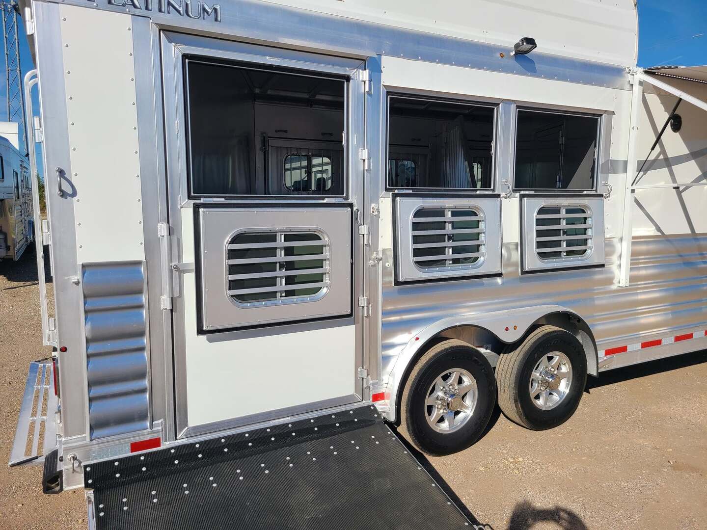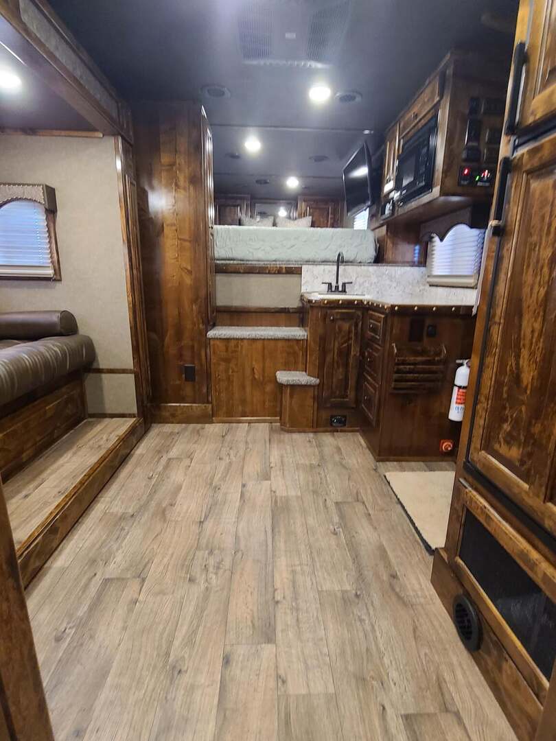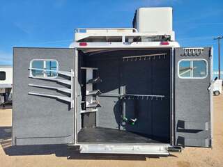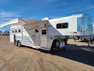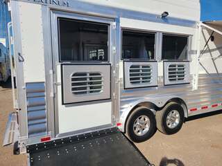 Platinum Coach 3 Horse 10’8” SLIDE OUT WITH SIDE LOAD!! Platinum Coach Features: 8’ wide x 27’ long x 7’6” tall 6’5” slide out with 72” sofa inside 7200# axles blocked 2”, 14 ply tires, aluminum wheels Side load configuration...HUGE TACK ROOM!! 52” tall spring loaded side ramp leading to 4’ stall Plenty of blanket bars, brush trays, and hooks in tack room!! 6’ hay pod with generator box on landing Two mangers, two access doors Drop down windows on head and hip Drop down window bars on head side Flow through and spring back dividers Stud divider with rubber on first stall Double aluminum battery box 3 outside LED load lights     Outlaw Conversion Features: 10’8” Proline XP living quarter with Dark Alder Ebony wood 72” sofa sleeper Onan 4.0 generator on roof with 9 gallon fuel tank Single leg hydraulic jack 6.0 propane / electric refrigerator Power awning with awning lights 32” Smart LED TV on arm Microwave over kitchen sink AM/FM/CD/DVD player with exterior speakers 15,000 BTU A/C with heat strip 20,000 BTU furnace 6 gallon water heater, 12vDC or 120vAC Two hat racks over door 30# propane bottles x 2 While we believe all information on this website to be accurate, please confirm features and price with a salesman.