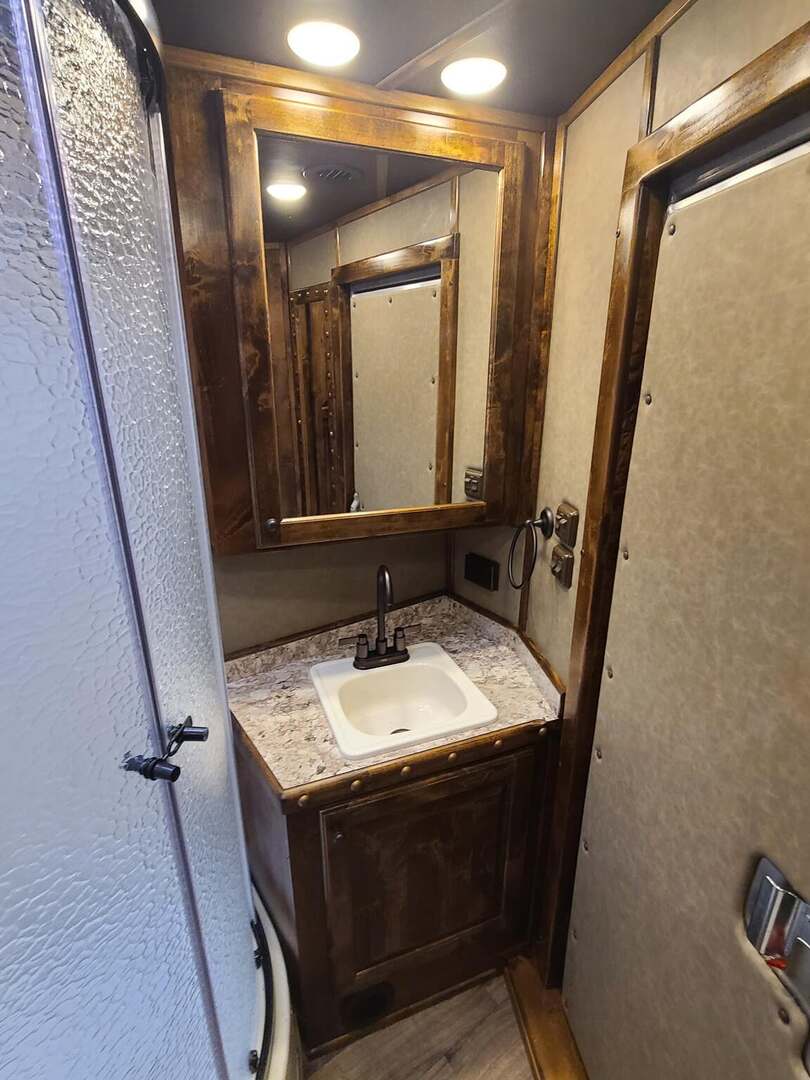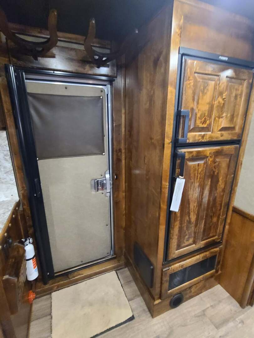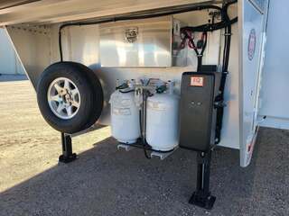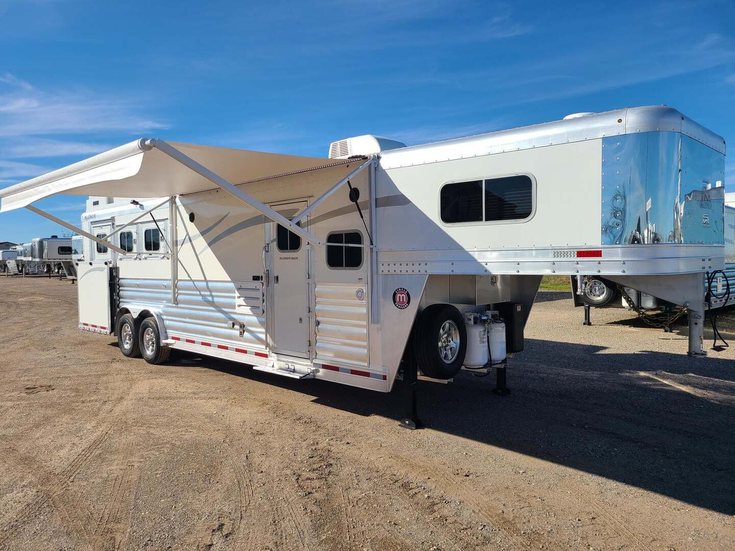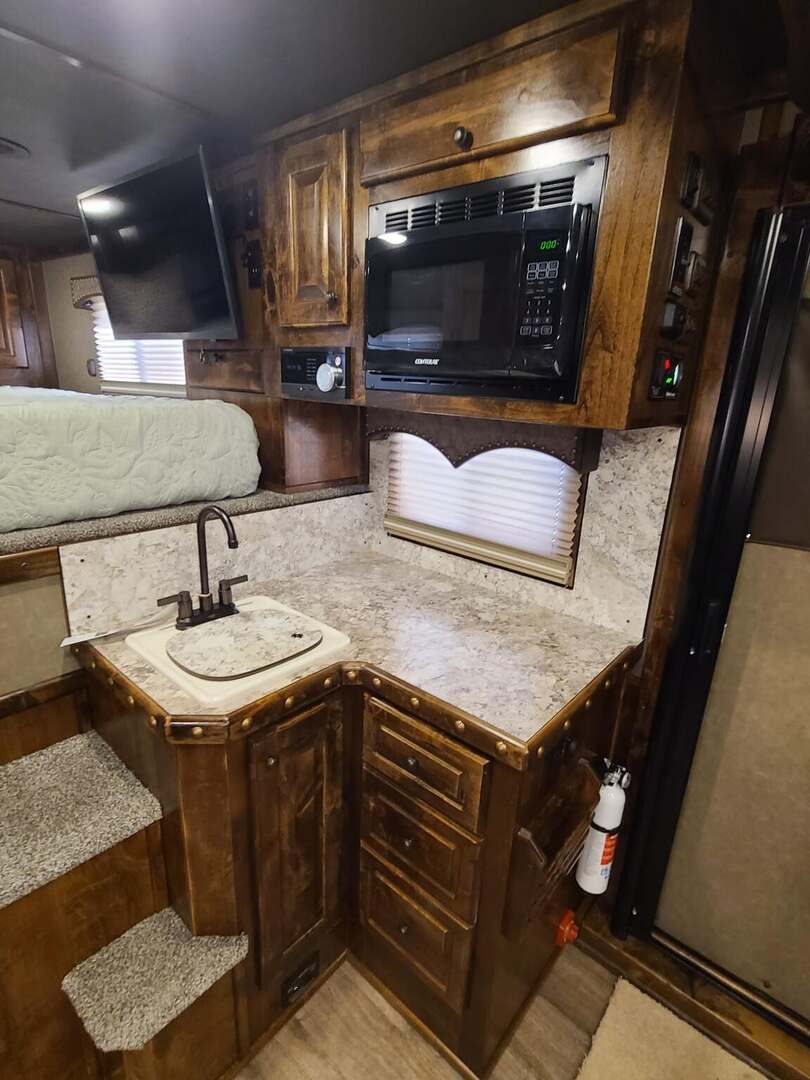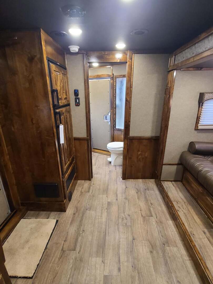 Platinum Coach 3 Horse 10’8” SLIDE OUT WITH SIDE LOAD!! Platinum Coach Features: 8’ wide x 27’ long x 7’6” tall 6’5” slide out with 72” sofa inside 7200# axles blocked 2”, 14 ply tires, aluminum wheels Side load configuration...HUGE TACK ROOM!! 52” tall spring loaded side ramp leading to 4’ stall Plenty of blanket bars, brush trays, and hooks in tack room!! 6’ hay pod with generator box on landing Two mangers, two access doors Drop down windows on head and hip Drop down window bars on head side Flow through and spring back dividers Stud divider with rubber on first stall Double aluminum battery box 3 outside LED load lights     Outlaw Conversion Features: 10’8” Proline XP living quarter with Dark Alder Ebony wood 72” sofa sleeper Onan 4.0 generator on roof with 9 gallon fuel tank Single leg hydraulic jack 6.0 propane / electric refrigerator Power awning with awning lights 32” Smart LED TV on arm Microwave over kitchen sink AM/FM/CD/DVD player with exterior speakers 15,000 BTU A/C with heat strip 20,000 BTU furnace 6 gallon water heater, 12vDC or 120vAC Two hat racks over door 30# propane bottles x 2 While we believe all information on this website to be accurate, please confirm features and price with a salesman.