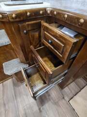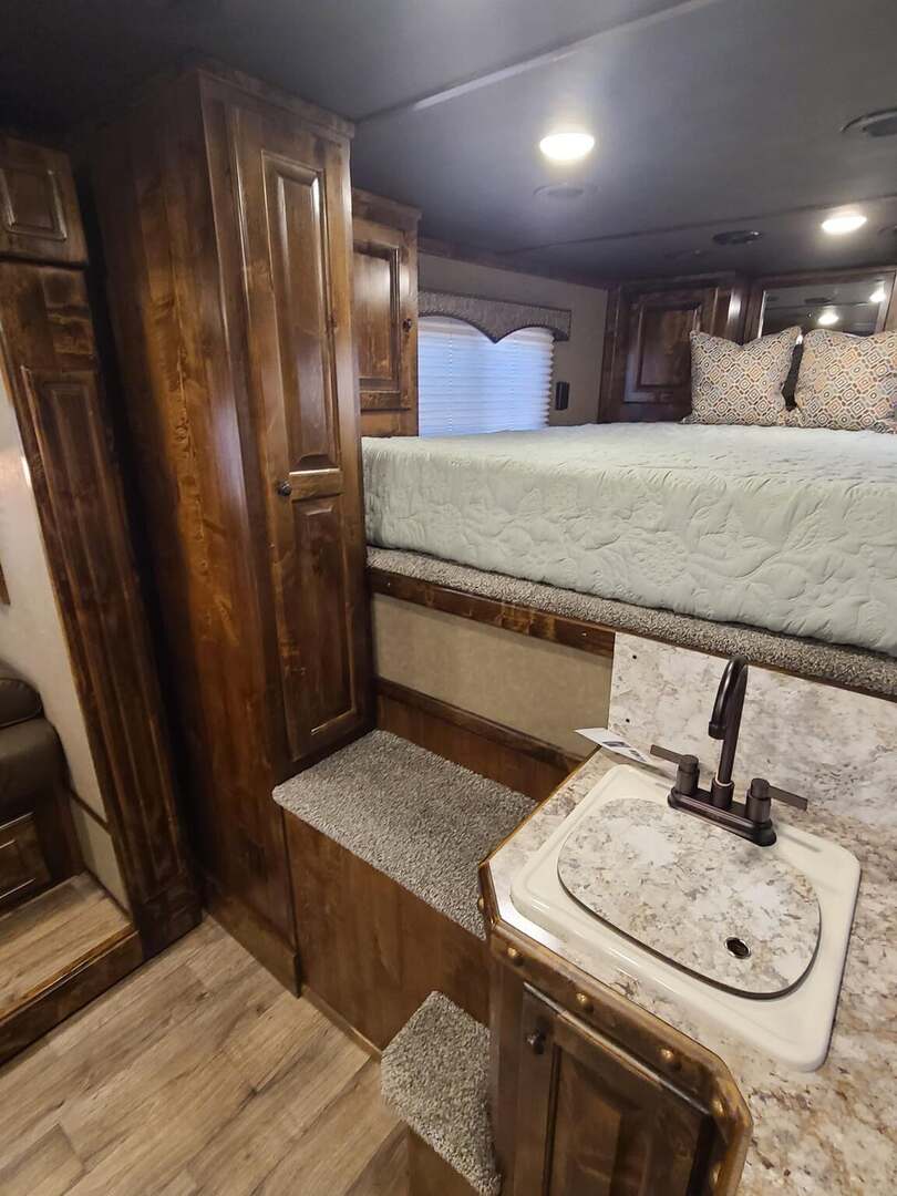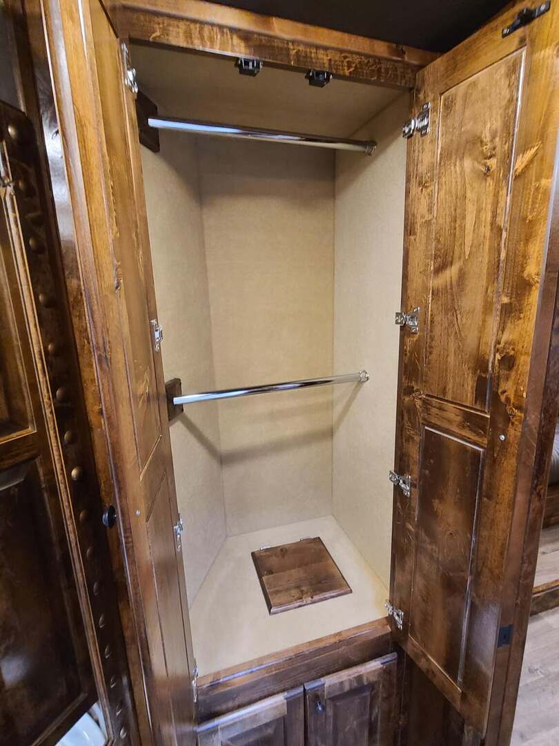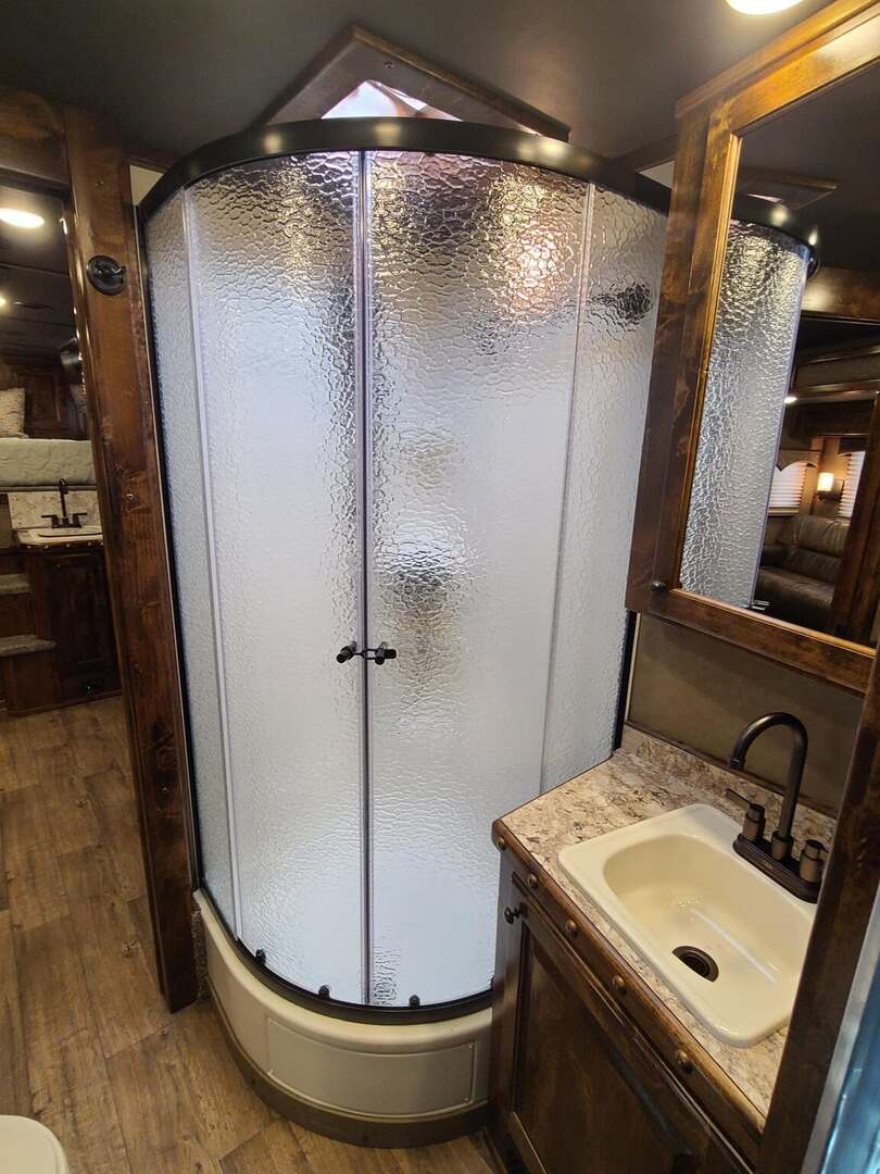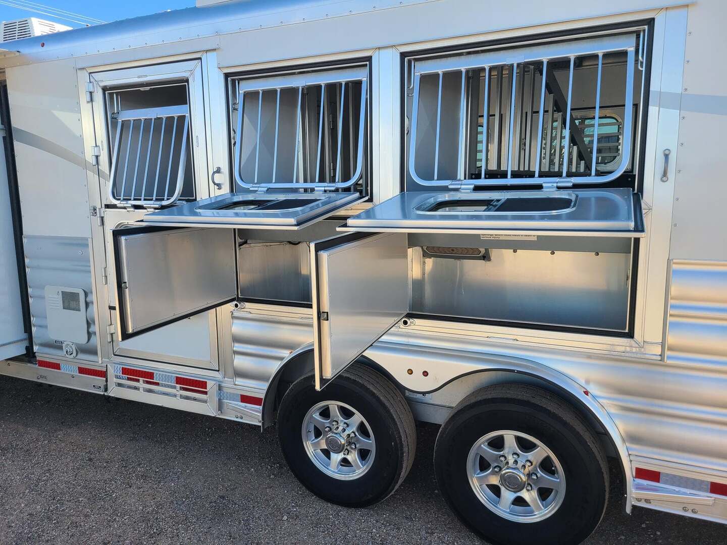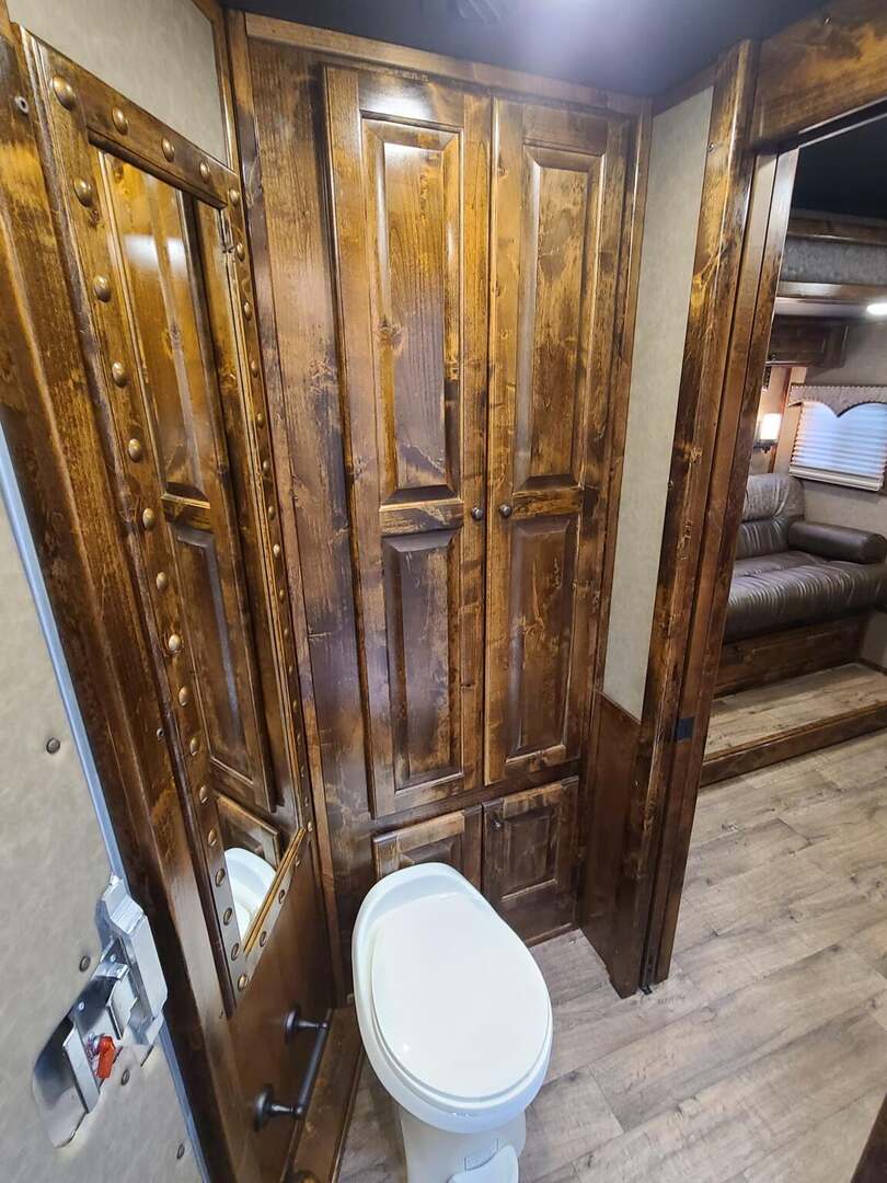 Platinum Coach 3 Horse 10’8” SLIDE OUT WITH SIDE LOAD!! Platinum Coach Features: 8’ wide x 27’ long x 7’6” tall 6’5” slide out with 72” sofa inside 7200# axles blocked 2”, 14 ply tires, aluminum wheels Side load configuration...HUGE TACK ROOM!! 52” tall spring loaded side ramp leading to 4’ stall Plenty of blanket bars, brush trays, and hooks in tack room!! 6’ hay pod with generator box on landing Two mangers, two access doors Drop down windows on head and hip Drop down window bars on head side Flow through and spring back dividers Stud divider with rubber on first stall Double aluminum battery box 3 outside LED load lights     Outlaw Conversion Features: 10’8” Proline XP living quarter with Dark Alder Ebony wood 72” sofa sleeper Onan 4.0 generator on roof with 9 gallon fuel tank Single leg hydraulic jack 6.0 propane / electric refrigerator Power awning with awning lights 32” Smart LED TV on arm Microwave over kitchen sink AM/FM/CD/DVD player with exterior speakers 15,000 BTU A/C with heat strip 20,000 BTU furnace 6 gallon water heater, 12vDC or 120vAC Two hat racks over door 30# propane bottles x 2 While we believe all information on this website to be accurate, please confirm features and price with a salesman.