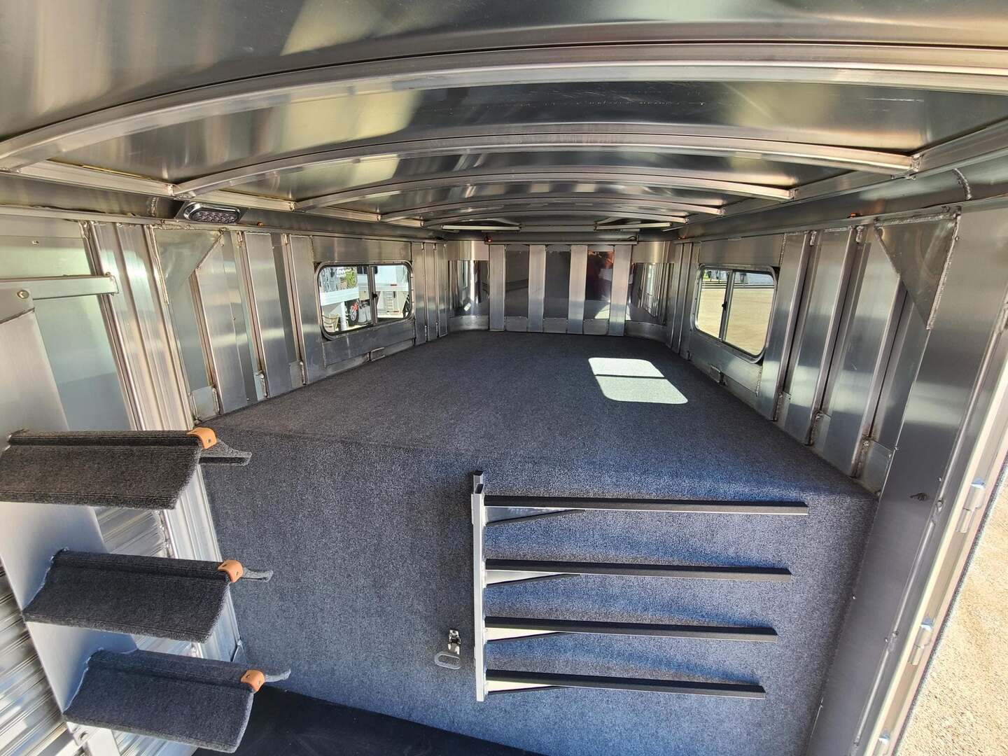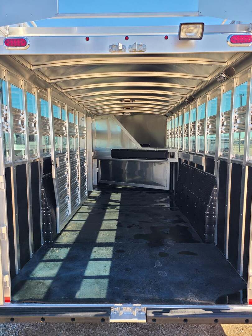 Platinum 25’ Stock Combo 7’6” x 25 x 7 tall Mill Finish skin Aluminum mag wheels Extremely versatile trailer!! 1st gate is horse divider with removable panel at bottom 2nd gate is normal horse divider 3rd gate is slatted center partition, keep horses and cattle separate!! Haul roping steers & 3 horses Haul 6 horses, 8 cows, haul whatever!! Plexiglas & Track on both sides of trailer Rubber in between wall studs on both sides 6’ hay rack & ladder 6 saddle racks, 15 bridle hooks, and 4 blanket bars in tack room!! 3 tier swing out saddle rack keeps all of your tack easily to grab!! Carpeted bulkhead wall to protect your gear Rubber mats in 30” dressing room floor for easy cleaning One brush tray and five hooks on tack door Stainless steel nose with Mill Finish exterior skin Double rear gates with double anti rack hardware Stock escape door on driver side 4 LED load lights and plenty of outside tie rings Two roof vents for maximum ventilation!! Ready for anything!!!
