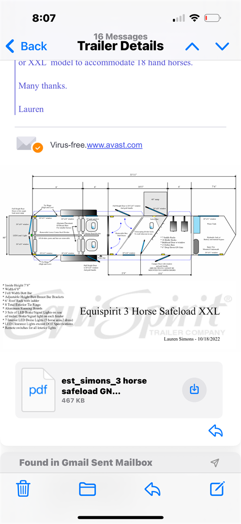 Barely used trailer with extra saddle racks, bridle hooks, water tank, electric jack, hay rack and ladder, extra large to accomodate 18hand horses, extra large carpeted tack room with door to stalls, all windows with screens. Located in Wellington, FL: 860-309-4482