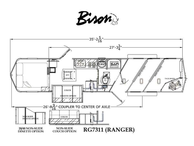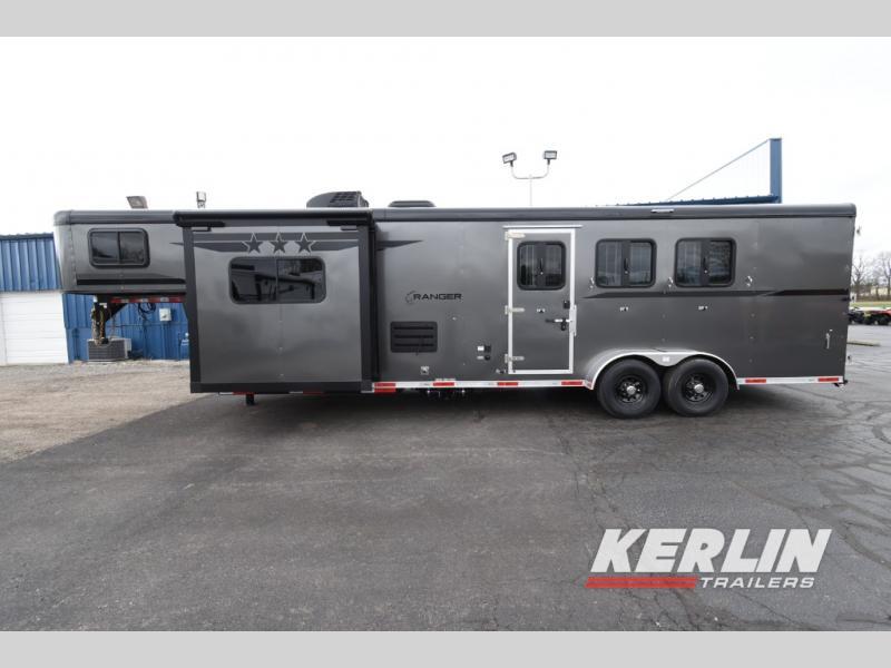This is a brand new 3 horse trailer with 11’ short wall and slide out! This Bison Ranger has the brand new interior colors!  It also features a few of the following  11’ short wall 3 horse 6’ slide out large 6 cub refrigerator sofa/sleeper 2 burner cook top sinkmicrowave tv prep ac furnace  Call us today to learn more