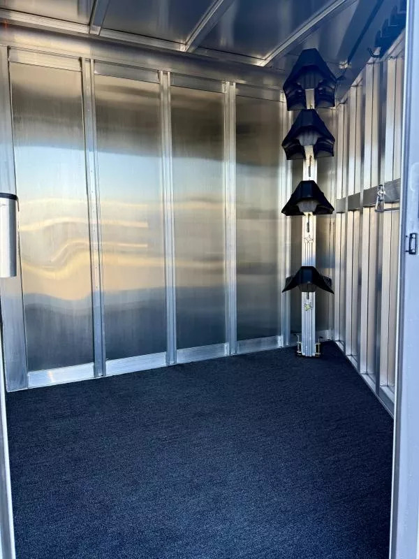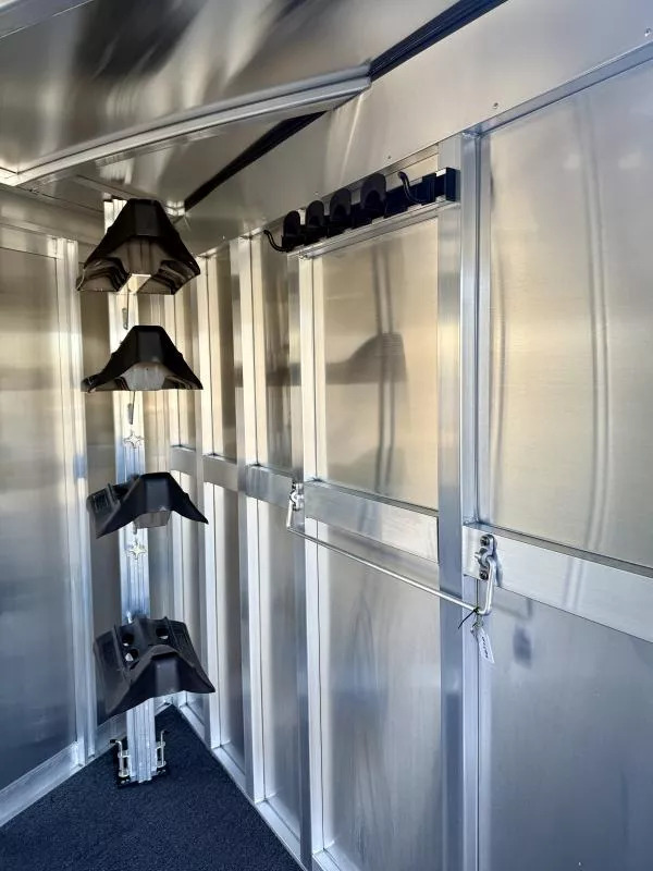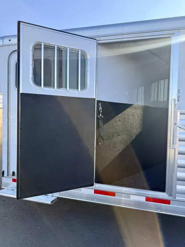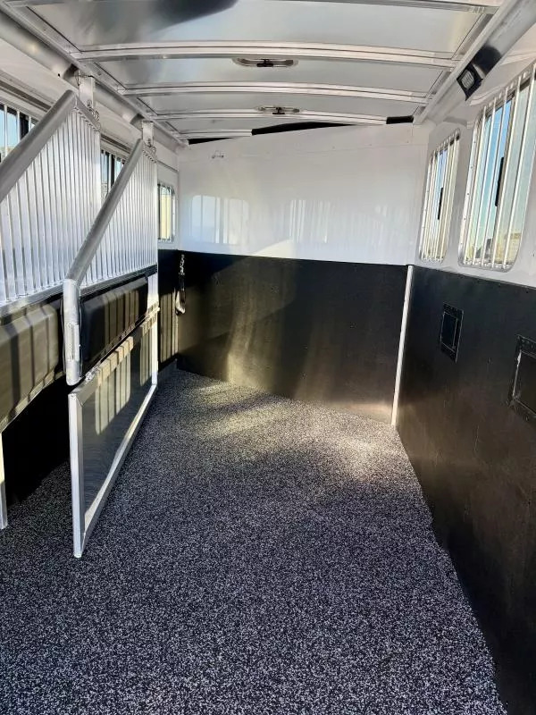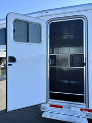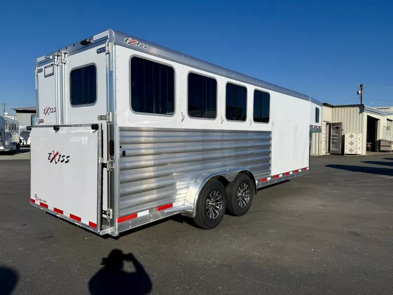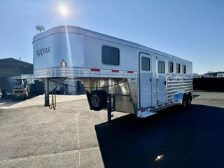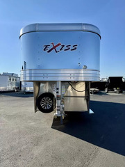 2026 Exiss 7400 GN - 7’ Wide, 4 Horse Slantload Trailer. * 7’2” Tall, 7’ Wide * All aluminum construction * Tandem 6,000# Torsion Axles * 16” Tires with 10 Ply Radials * Aluminum Wheels * 4 wheel electric brakes * GREAT Extruded Aluminum Floor * White Smooth Aluminum Skin Exterior * Extruded Aluminum Panels at Exterior Horse Area * One piece Aluminum Roof * 8 Outside Tie Rings, 4 Each Side * LED Load Light at Rear * Rear Ramp * 4’6” sw Carpeted Front Dressing Room Includes: * 4 Tier Adjustable, Removable, Saddle Rack (moves to rear tack) * Camper Door with Screen Door and Sliding Window * Fold Down Camper Step * Halter Hooks, Brush Tray, Blanket Bar, & Clothes Rod * Sliding Windows in GN * LED Dome Lights on Switch * Horse Compartment Features: * 1st Stall Escape Door * Lower Panel Divider 1st Stall * 2 Way Pop-Up Roof Vents * Horse Area Kickwalls are Double walled to the Ceiling (with Rubber up 48”) * Padded Aluminum, Air Flow, Slant Dividers on Slam Latches * Drop Down Feed Doors with Drop Bars Headside * Large Sliding Bus Windows Buttside * Easy Care Flooring * (2) Inside Tie Rings per Stall * LED Interior Lights with Switch on Rear Frame * 55/45 Double Rear Doors with Camlocks * Rear Ramp * Locking Keyed Hasps on Rear Doors and Escape Door * Collapsible Rear Tack Wall * Saddle Rack Location * Halter Hooks on Rear Door * LED Brake and Running Lights * Spare Tire on Aluminum Wheel Call D2 Trailer Sales 209-745-5480 or for more info www.d2trailersales.com