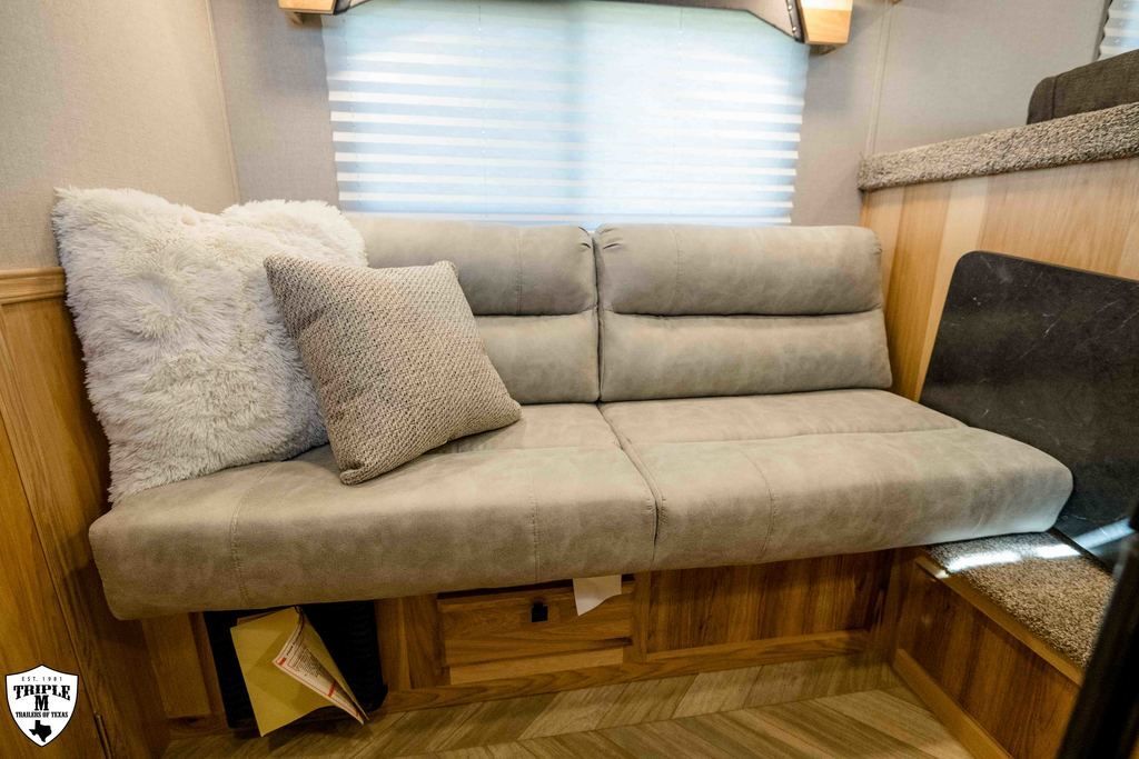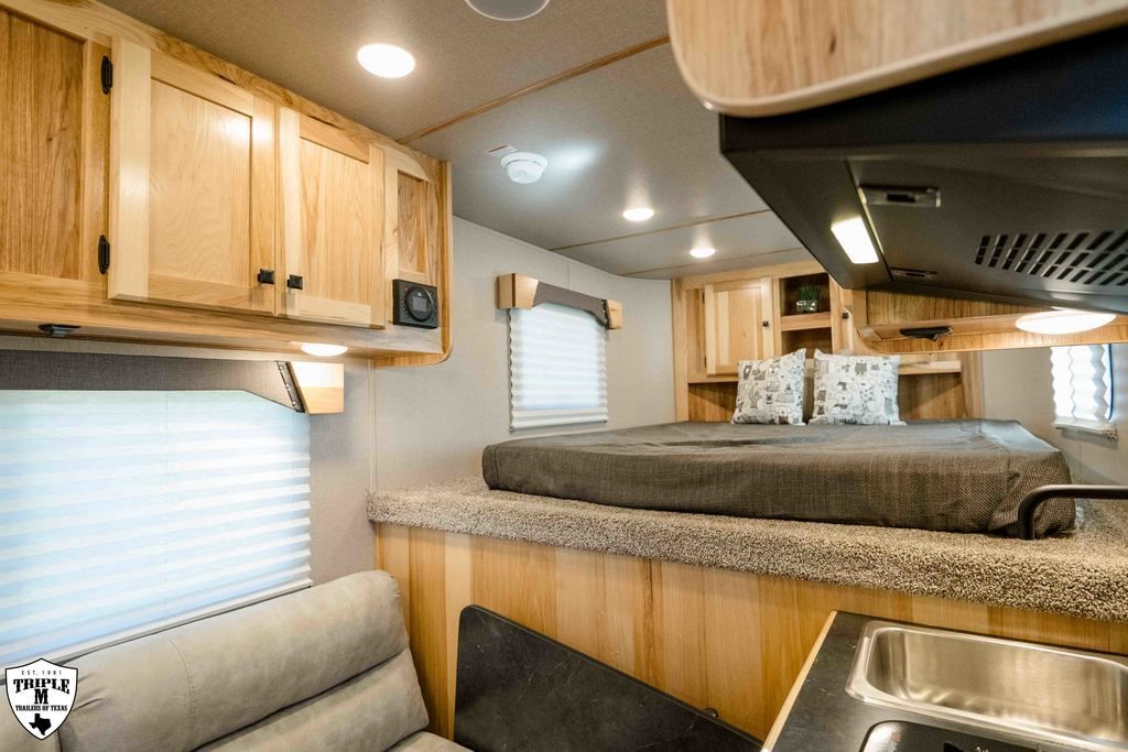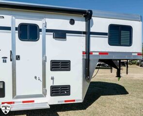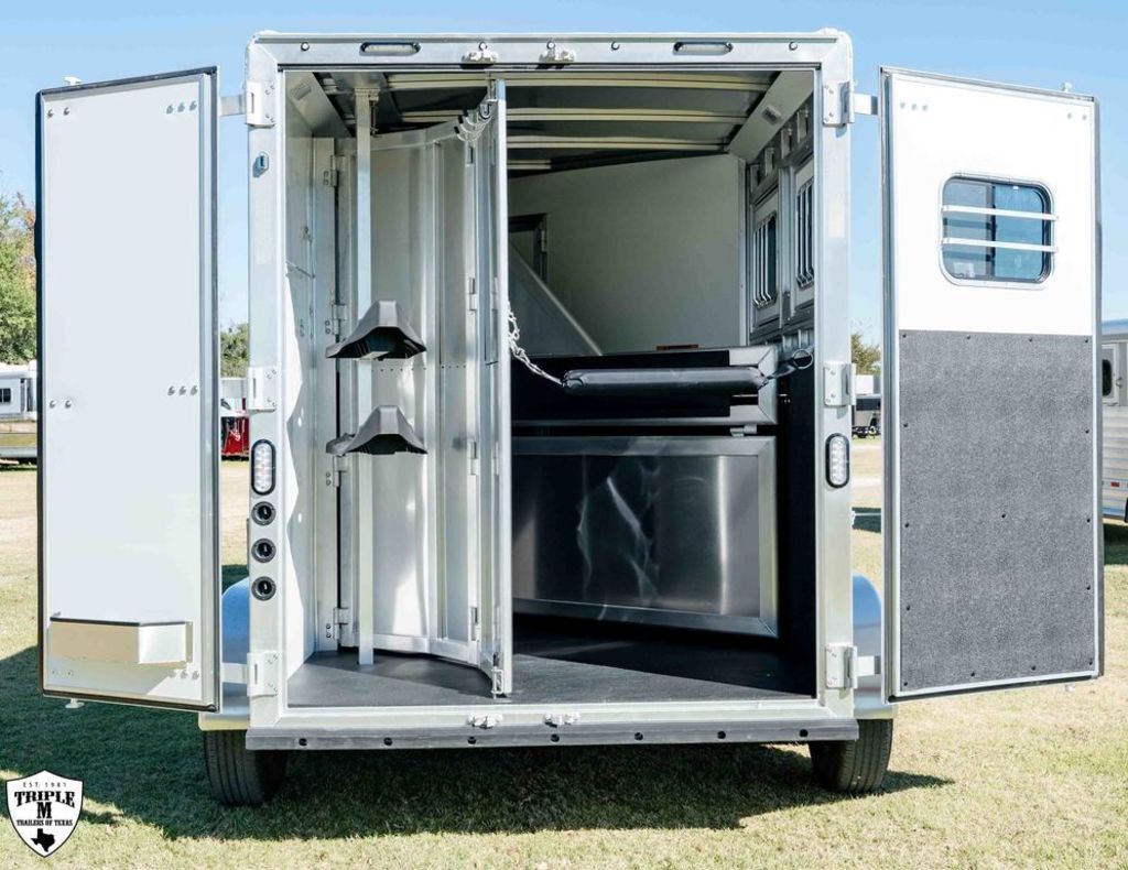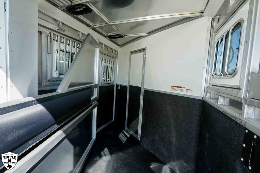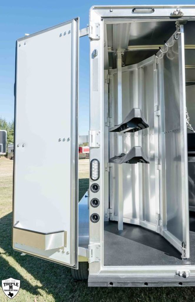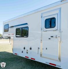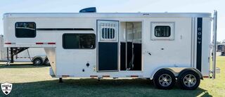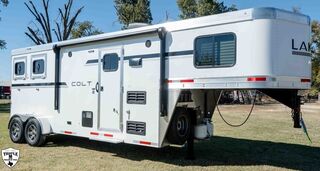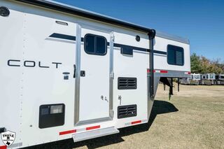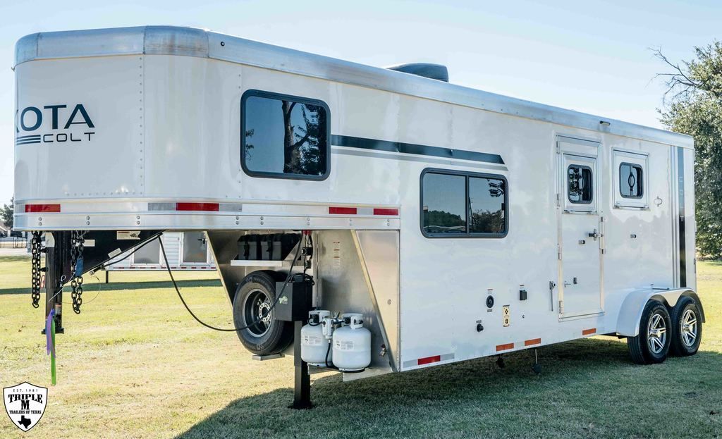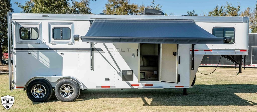 COLT 2 HORSE w/ 7’ LQ 18’ FLOOR / 26’ OVERALL 6’9 WIDE / 7’6 TALL SMOKE ALUMINUM WHEELS SINGLE 12K HYDRAULIC JACK HICKORY WOOD PACKAGE DROP DOWN WINDOWS ON BOTH SIDES SKYLIGHT IN BATH ADDED FOLDING TABLE SINGLE KITCHEN SINK MICROWAVE / 3CUFT FRIDGE A/C SHOWER / TOILET / SINK IN BATHROOM SOFA / SLEEPER CABINETS PADDED DIVIDERS REAR TACK w/ SADDLE SEATS / BRIDLE HOOKS / LIGHT ROOF VENTS WHITE EMPTY = 6,365 GVWR = 10,400