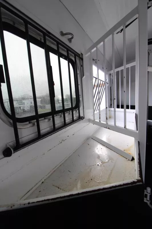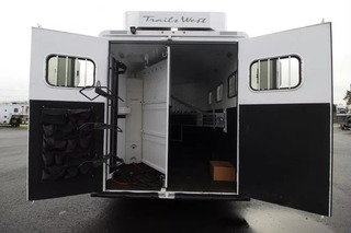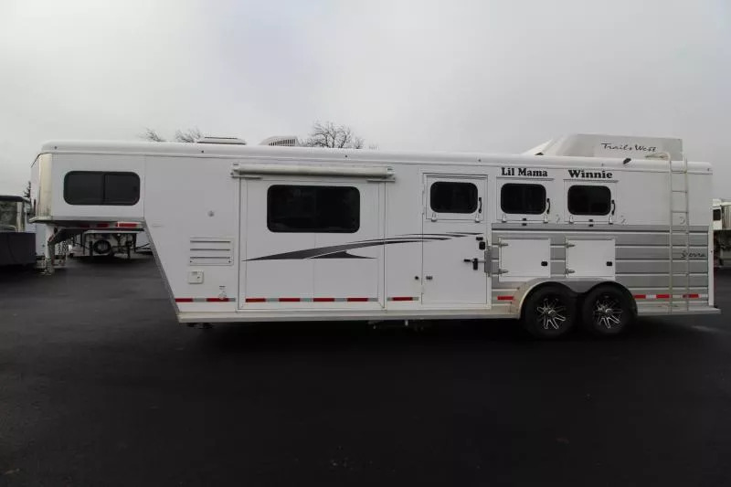 Trails West Sierra 3 Horse LQ with a 10’ Short Wall and a Slide-out. This Trailers includes Easy Care Flooring, Generator Ready with a Hay Rack Escape Door and more! CONSTRUCTION AND EXTERIOR: Camper Door w/ 24” Window 7’0” Width 7’6” Height 8’0” Gooseneck 10,000 lbs Dry Weight Hydraulic Jack Retractable Step under Camper Door Stabilizer Jacks each Side Electric Awning Hoof Grip Flooring in Horse Compartment SAFETY: Locking Water Fill Door Fire Extinguisher CO2/Smoke Detector L.P. Detector Alternate Emergency Exit ELECTRICAL: Locking Battery Box Monitor Panel 12v Outlet 110v Outlets 110v/12v Power Converter w/ Charger 30’ Service Cord AM/FM Stereo with CD Player TV Antenna w/ Power Booster Porch Light by Camper Door Lighted Grab Handle by Exterior Door Recessed LED Lighting Day/Night Shades with Upgraded Valances HEATING/INSULATION: Dual 5 gal. Propane Tanks w/ Auto Changeover Fully Insulated Floor, Roof and Walls 18,000 BTU Furnace Air Conditioner SLEEPING ACCOMMODATION: Dinette converts into Bed Sofa converts into Bed Mattress in bed area FRESH AND WASTE WATER SYSTEMS: Low Point Fresh Water Drains Demand-type Water Pump 48 gal. Fresh Water Tank 28 gal. Black Water Holding Tank 28 gal. Gray Water Holding Tank 6 gal. DSI Water Heater Sewer Hose Storage Compartment S ewer Hose and Adapter INTERIOR: Soft Touch Ceiling Synthetic Leather Cushions Wood Valances Vinyl Floor w/ Wood Print Throughout Hardwood Cabinetry BATHROOM: 25” x 30” Shower Stall with Glass Door 12v Exhaust Fan Fresh Water Flush Toilet Wash Basin with Vanity GALLEY: 2 Burner Cook Top with Range Hood 6 cu.ft. Double Door Refrigerator Stylish Black Sink Wood-trimmed Counter Tops Tiled Backsplash Flip-up Counter Top Extension Microwave/Convection Oven Hoof-Grip Easy Care Flooring is a high traction, shock absorbing permanent flooring. It will make your horses safer, more comfortable, and perform better, all the while enhancing the appearance and functionality of your trailer and saving you time and money on shavings and clean-up. Drain holes are drilled in the trailer floor and then the floor is coated with a sealant to prevent moisture from coming in contact with the trailer floor. Then 3/4” of pervious rubber is troweled in to the trailer to create a permanent shock absorbent floor which lets urine drain straight through to the ground. No more shavings. No more slippery, heavy mats. No more muck. Manure can be shoveled out and then the remains can be easily rinsed out with a hose. NO MORE SHAVINGS IN YOUR HORSES EYES AND LUNGS. Hoof-Grip Easy Care Flooring reduces the impact and shock on horses’ hooves and legs, which means that even horses with hoof and leg soreness are more stable and comfortable. Since your horses don’t have to strain to maintain their footing, they can be more relaxed. And since Hoof-Grip Easy Care Flooring is a noise suppressant and heat barrier, the cooler, quieter ride will further reduce mental and physical stress normally associated with trailering your horses. This trailer is in overall great condition, some damage to the hoof-grip floor due to aggressive pawing, Rubber mat placed on top. ** Descriptions Subject to Error** For more information on this trailer please contact Double J Trailers at 360-225-1234. Thank You! Financing available to qualified buyers! All trailer prices are cash prices. Thank you! Trades Welcome Two Lots To Better Serve You! Woodland Washington & Albany Oregon We have over 250 trailers in stock. Please view our entire inventory at [www.double-j.com](http://www.double-j.com/) thank you! *Double J imposes a surcharge of 3% on credit card purchases of amounts greater than $500*