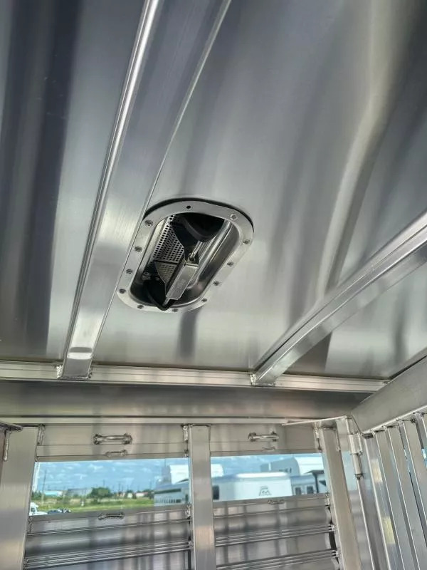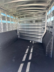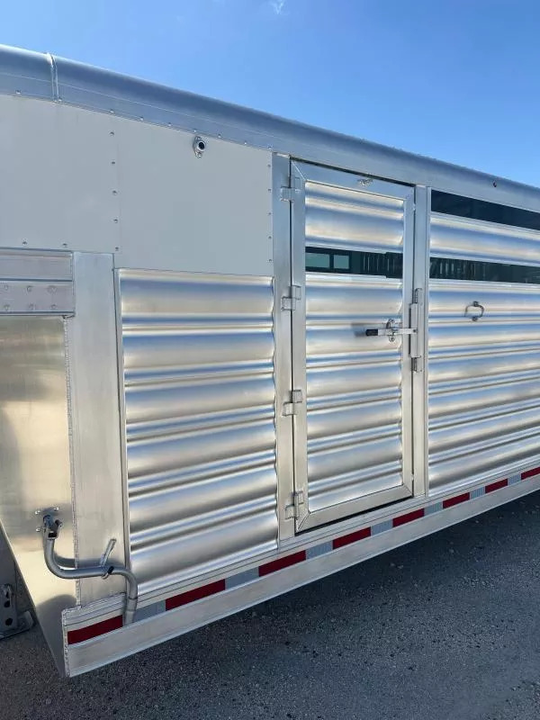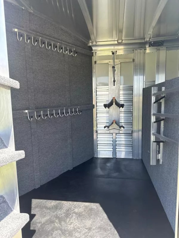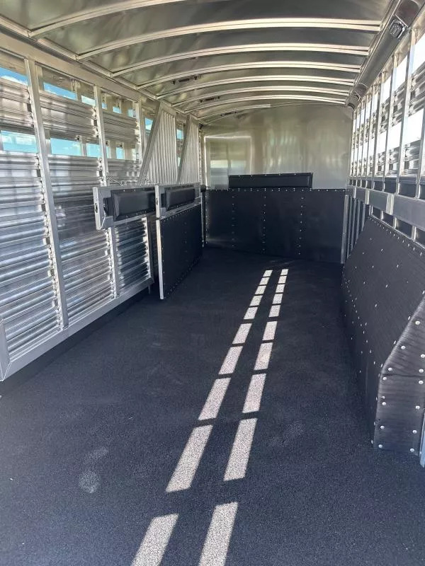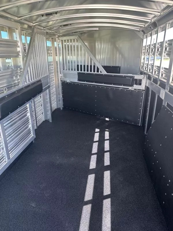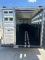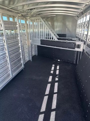 Extremely versatile, convenient to use trailer. 3 individual horse stalls up front and room for 2 more behind the divider gate. EXTRA WIDE 4 ft. tack door for easy and convenient use of swing out saddle racks. Walk past saddles when they are swung out. WERM flooring FLOW THROUGH, padded, removable horse dividers Stud divider/removable baby panel, double walled, lined with rubber for safety Escape door for first stall Rubber lined kick wall Divider gate - on a slant, to divide horses from cattle EXTRA WIDE horse loading door and rear double doors Aluminum wheels 14 ply tires Roof vents Plexiglass, removable, head side Saddling light - Long LED