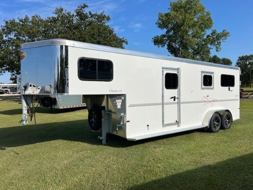 CHARTER TR SE 2+1 GOOSENECK 22’1 FLOOR / 30’1 OVERALL 6’9 WIDE / 7’6 TALL STAINLESS NOSE WRAP CAMPER VENT IN TACK PORCH LIGHT (2) PORCH/LOAD LIGHTS HD HINGES PER DOOR REAR TAIL CURTAINS REAR RAMP SIDE RAMP w/ TAIL CURTAIN PADDED DIVIDERS SUNCOATED WALLS RUBBER MATS ROOF VENTS SIDE WINDOWS FRONT STORAGE / TACK WHITE SKIN EMPTY = 4,940 GVWR = 9,990