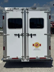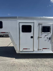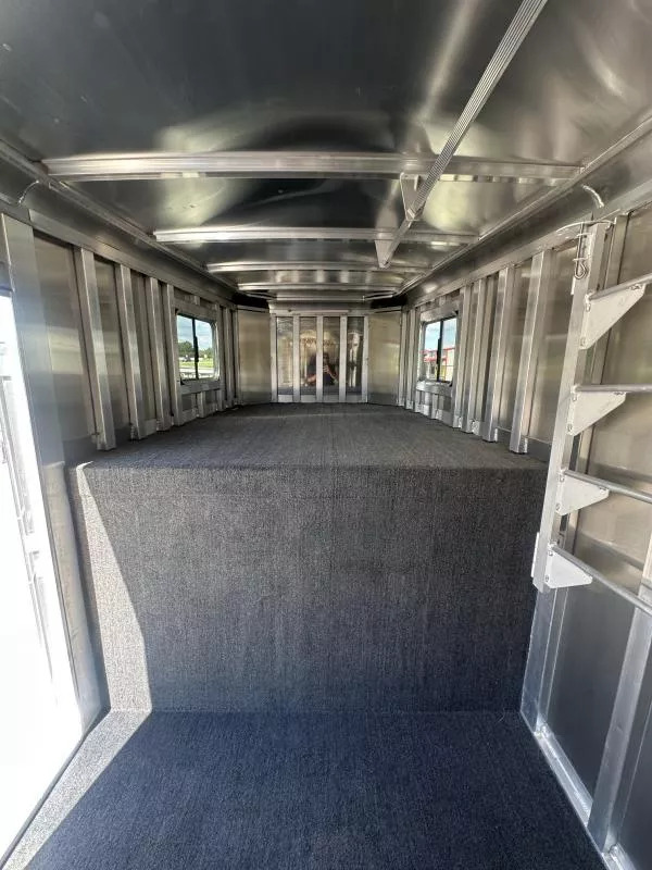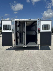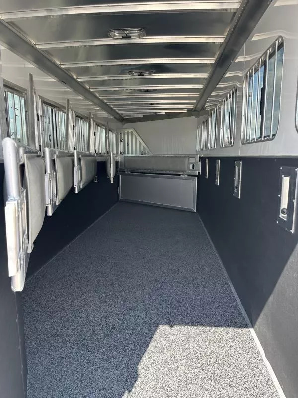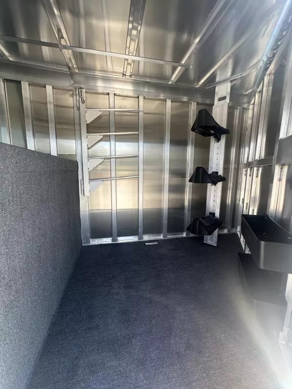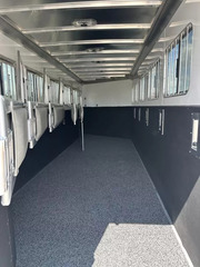 Horse area - EZ Care floor, 48” rubber lined kick walls, lined and insulated to the ceiling, first stall escape door, square drop feed door and drop faceguards on each stall (head), bus windows (hip), Air Flo dividers with pads, first stall hanging partition, pop up roof vents, interior LED lights, inside tie rings, rear folding/removable tack, 3 tier adjustable and interchangeable saddle rack, halter hooks.