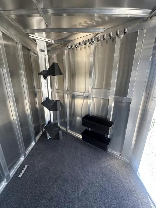 Dressing room - 50” short wall, turf on floor, turf on drop wall and in nose, 5’ long clothes rod, brush box, halter hooks, 3 tier adjustable and interchangeable saddle rack, place for adjustable and interchangeable saddle rack, swing out blanket bars, interior LED lights, camper style entry door, screen door.
