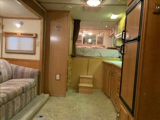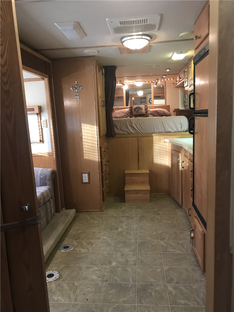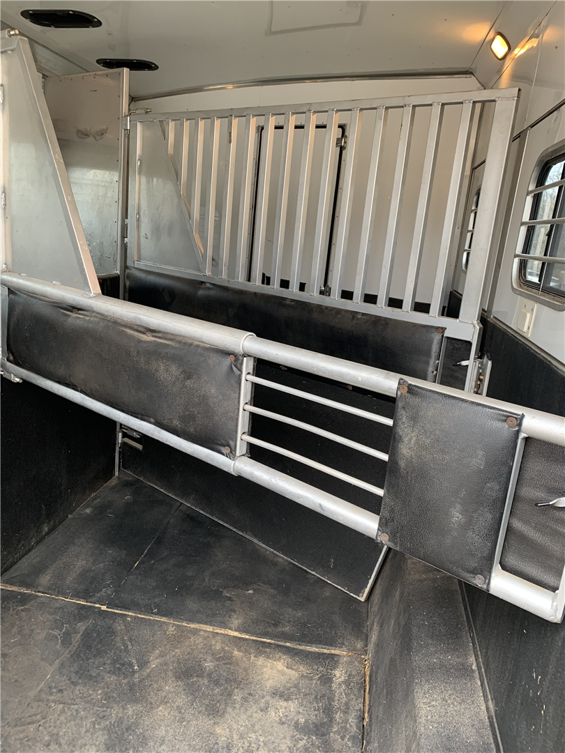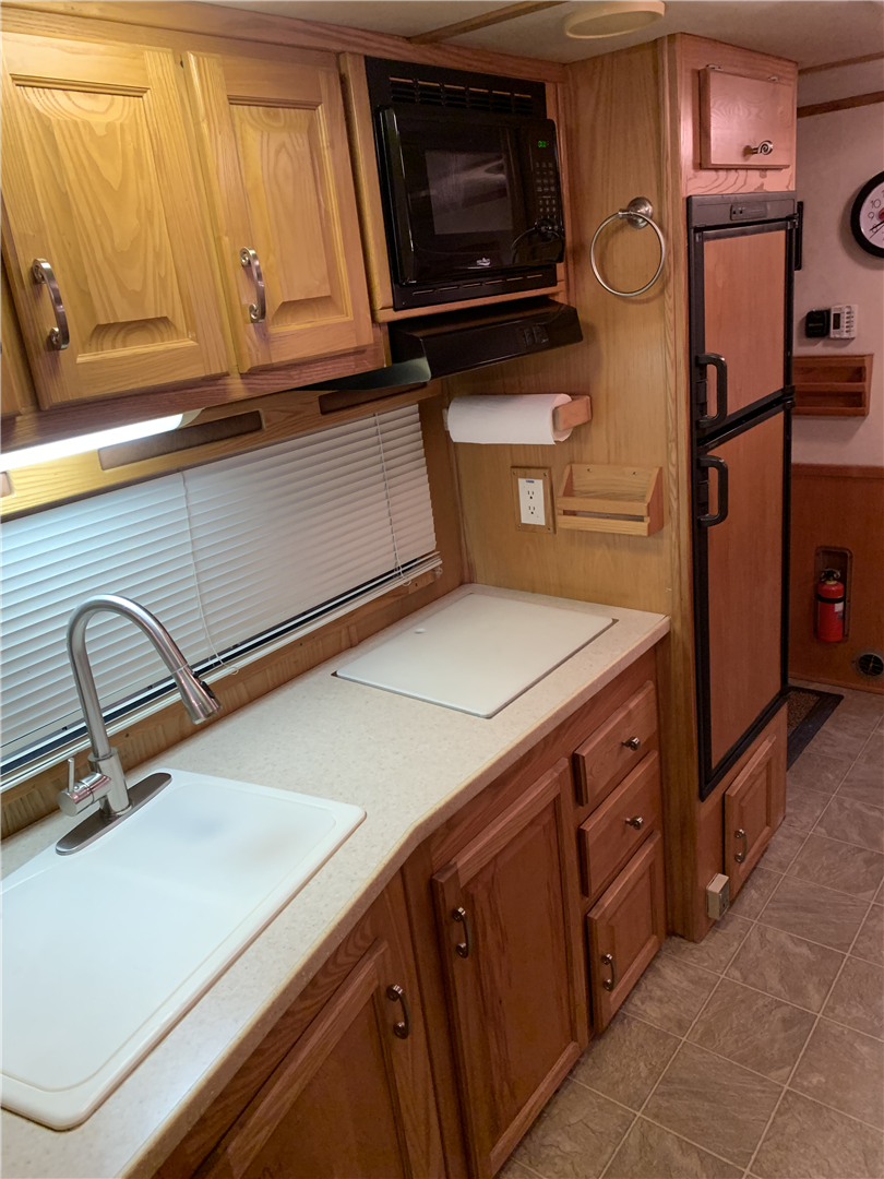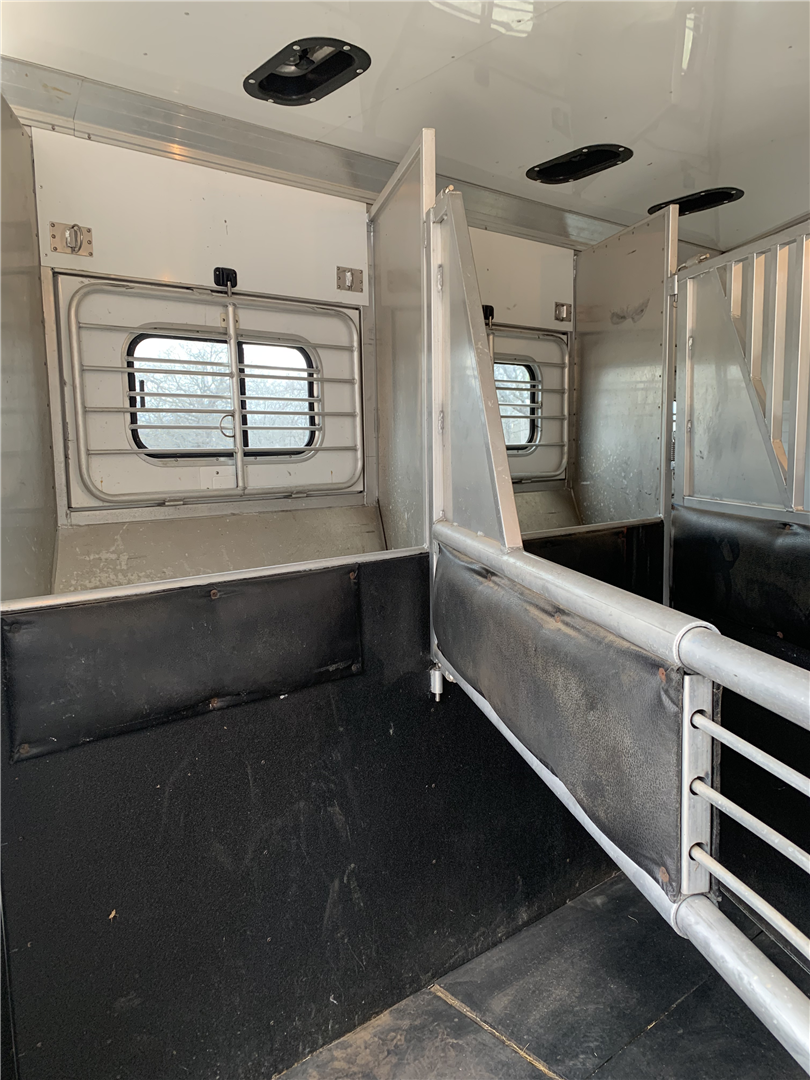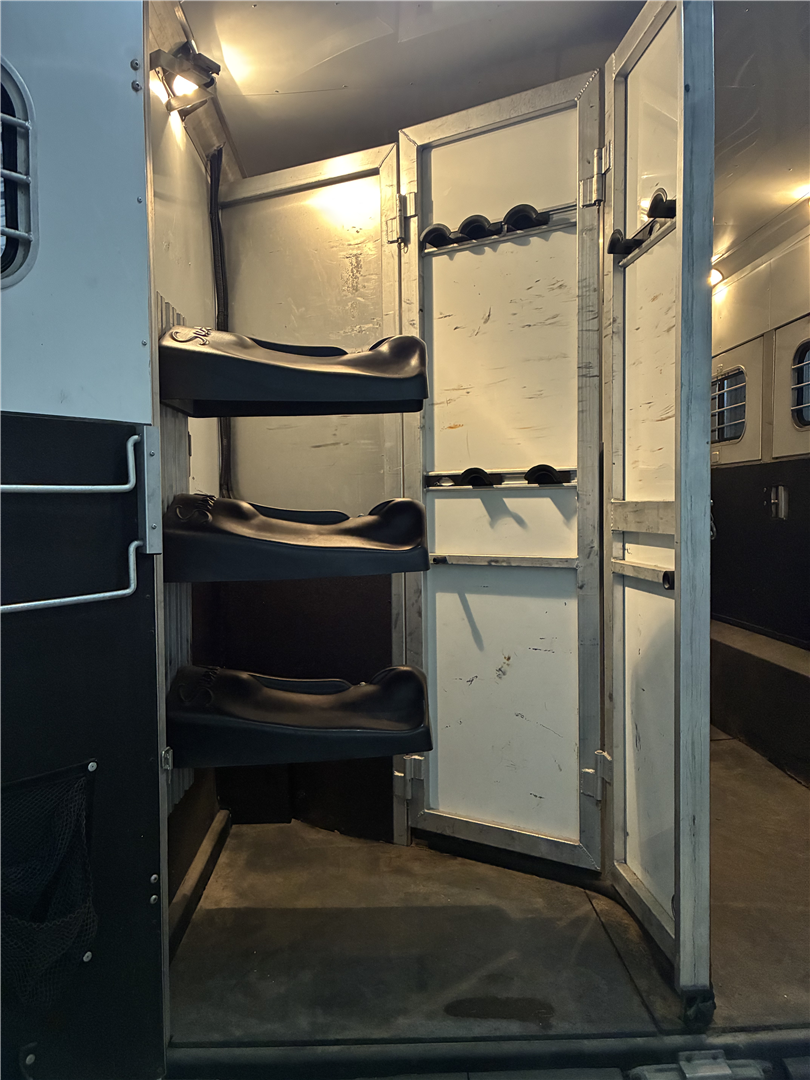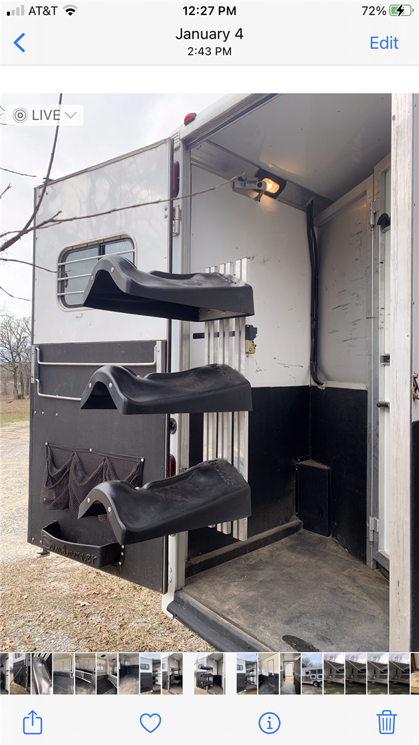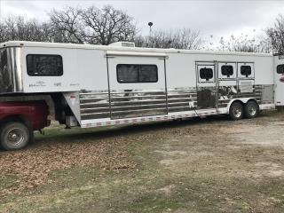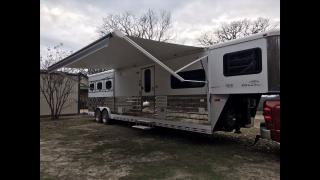 This spacious LQ trailer sleeps 4. It features a sofa with a full size hide-a-bed in the hydraulic 6' slide. Lots of storage! The hard wood cabinetry throughout includes a closet for hanging clothes with drawers in the main area and another hanging clothes closet with storage in the bathroom. The kitchen has double sinks (with a solid cover that sits flush with the counter), 2 burner propane stove (with a solid cover that sits flush with the counter), vent-a-hood & light, microwave, large refrigerator and freezer, more cabinets for storage in the kitchen. The bathroom in addition to the clothes and storage closet has 2 medicine cabinets, toiletry cabinet and cabinet storage below the sink and countertop, toilet, large shower with a glass enclosure and a skylight above it, a vent in the ceiling, pocket door. Walk thru door to the horse area. The bedroom area has a queen mattress, cabinet storage on both sides, privacy curtain, several lighting options. Night/ Day shades on the windows with mini blinds in the kitchen and on the door window. Ducted AC and propane furnace, onboard 4000-Watt Onan generator that can be turned on by a switch on the interior control panel or outside in the manger compartment where it resides. The extra deep electric awning is powered by the interior control panel. The trailer has hydraulic jack, exterior water hydrant, 2 LP tanks. The trailer has drop down windows on both sides, escape door, full stud divider in the first stall, 2 mangers, roof vents and rubber mats, interior lighting in the horse area and in the collapsible rear tack. The tack has a swing out saddle rack, blanket bars and net pockets on the door for tack storage, exterior lighting behind the trailer for loading/unloading and for tack. The other manger storage compartment (generator is in one) has net pockets inside the door for storage. This trailer has all of the conveniences for comfort and ease.