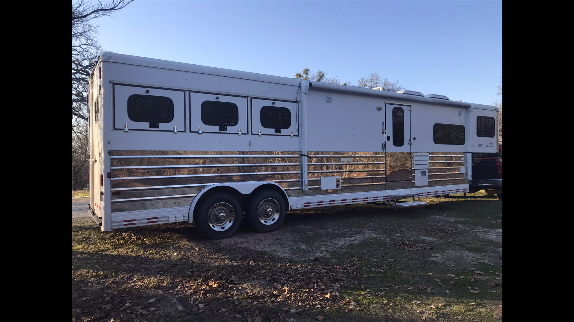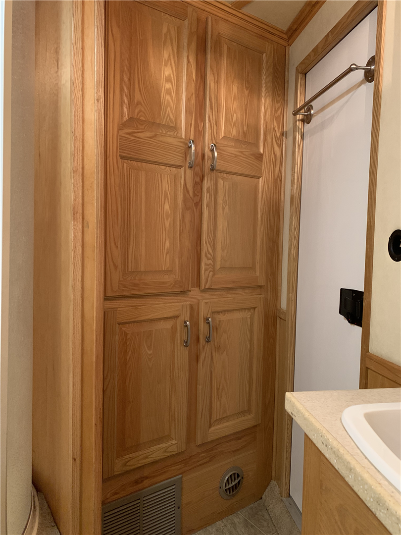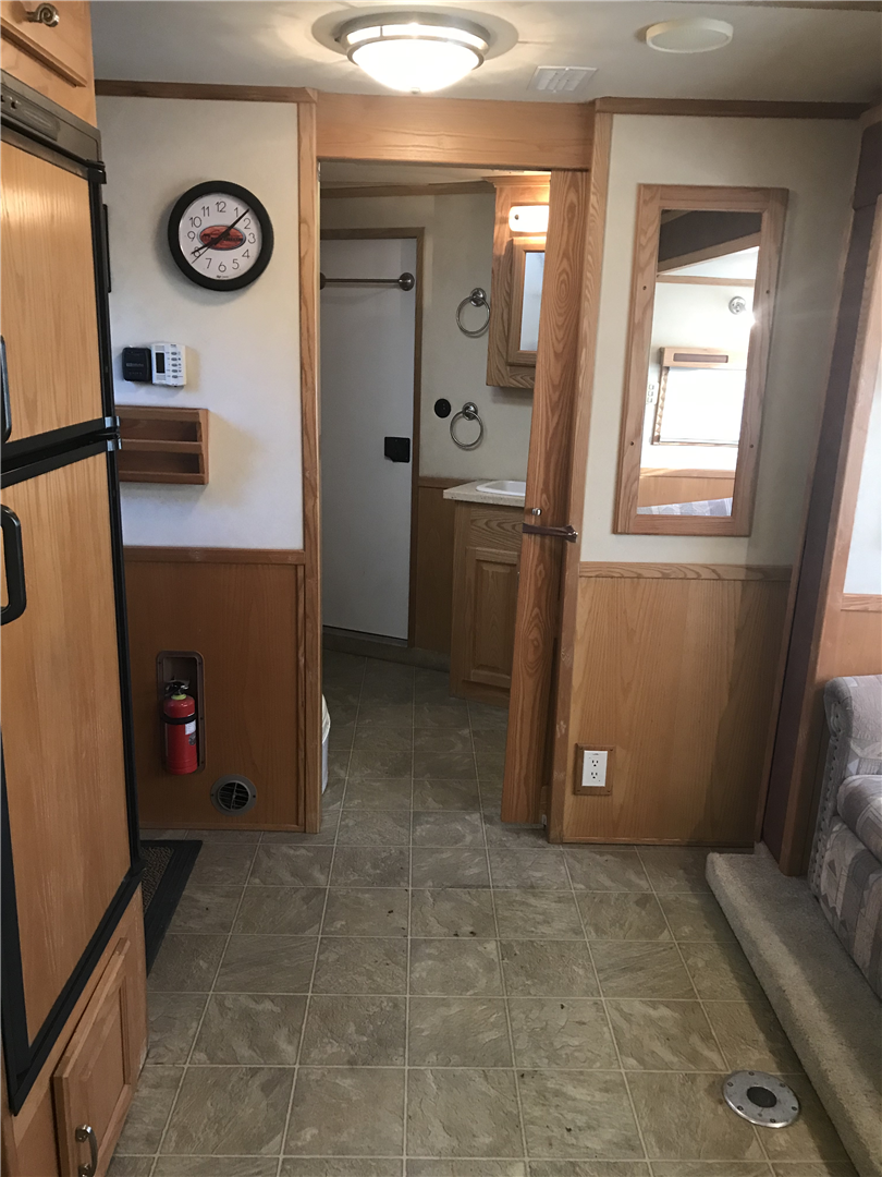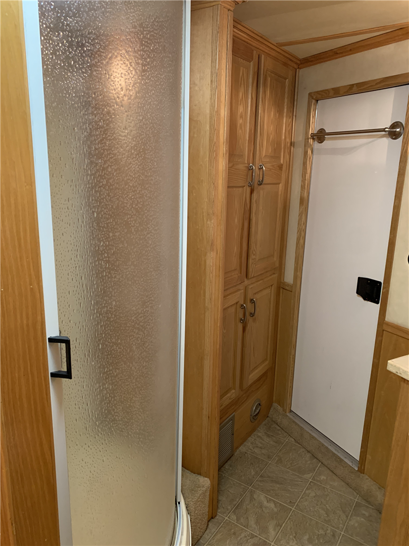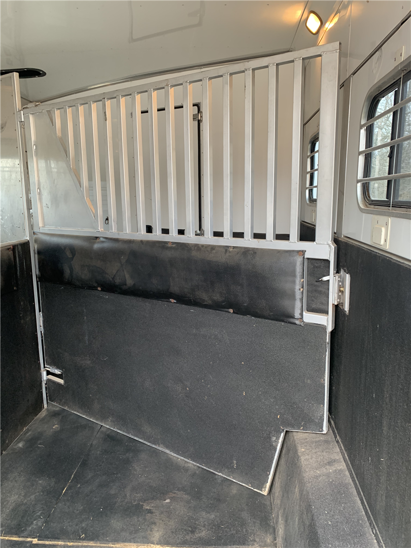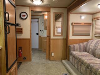 This spacious LQ trailer sleeps 4. It features a sofa with a full size hide-a-bed in the hydraulic 6' slide. Lots of storage! The hard wood cabinetry throughout includes a closet for hanging clothes with drawers in the main area and another hanging clothes closet with storage in the bathroom. The kitchen has double sinks (with a solid cover that sits flush with the counter), 2 burner propane stove (with a solid cover that sits flush with the counter), vent-a-hood & light, microwave, large refrigerator and freezer, more cabinets for storage in the kitchen. The bathroom in addition to the clothes and storage closet has 2 medicine cabinets, toiletry cabinet and cabinet storage below the sink and countertop, toilet, large shower with a glass enclosure and a skylight above it, a vent in the ceiling, pocket door. Walk thru door to the horse area. The bedroom area has a queen mattress, cabinet storage on both sides, privacy curtain, several lighting options. Night/ Day shades on the windows with mini blinds in the kitchen and on the door window. Ducted AC and propane furnace, onboard 4000-Watt Onan generator that can be turned on by a switch on the interior control panel or outside in the manger compartment where it resides. The extra deep electric awning is powered by the interior control panel. The trailer has hydraulic jack, exterior water hydrant, 2 LP tanks. The trailer has drop down windows on both sides, escape door, full stud divider in the first stall, 2 mangers, roof vents and rubber mats, interior lighting in the horse area and in the collapsible rear tack. The tack has a swing out saddle rack, blanket bars and net pockets on the door for tack storage, exterior lighting behind the trailer for loading/unloading and for tack. The other manger storage compartment (generator is in one) has net pockets inside the door for storage. This trailer has all of the conveniences for comfort and ease.