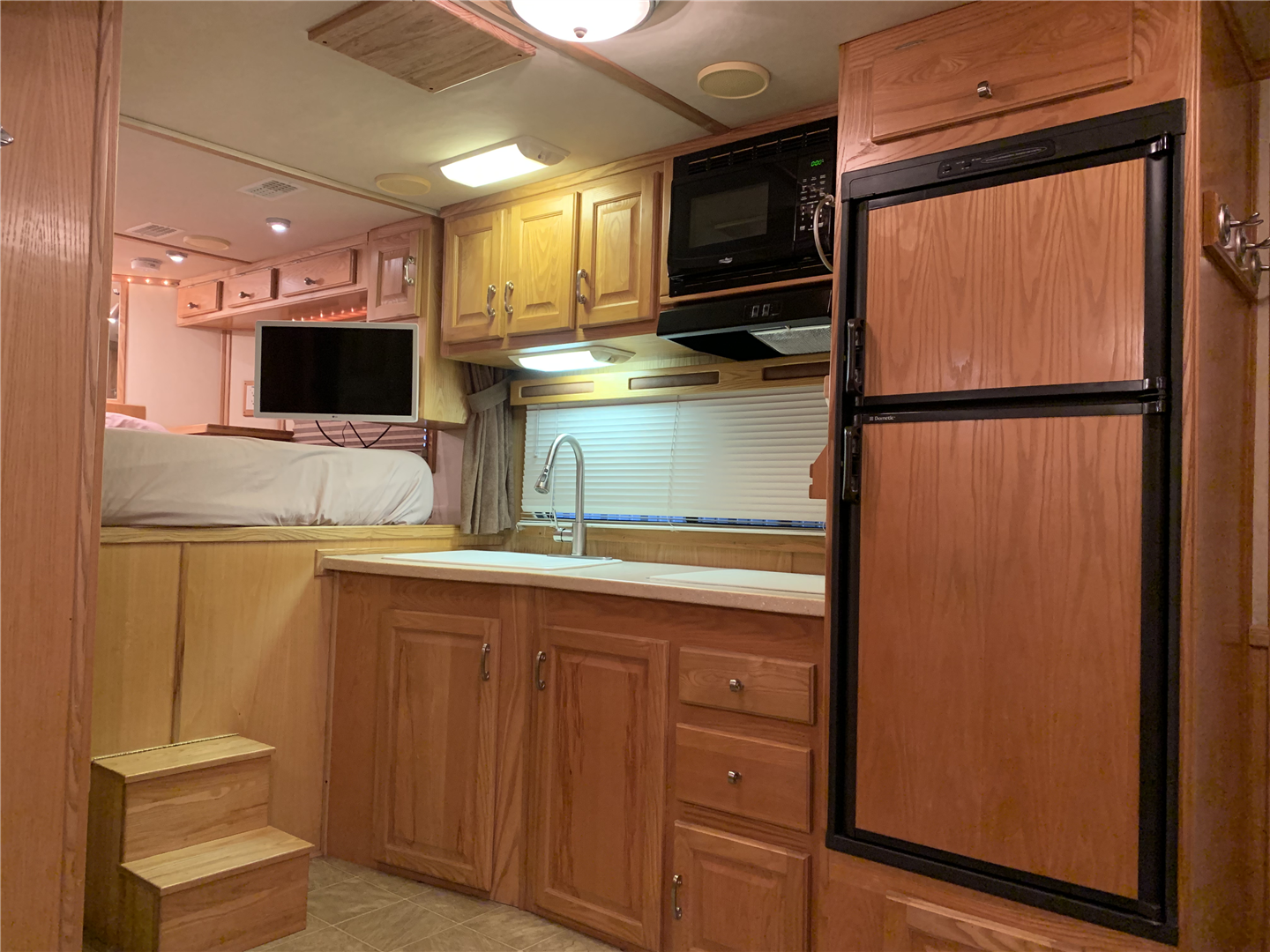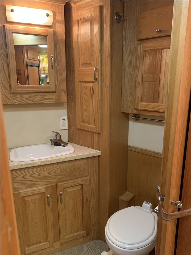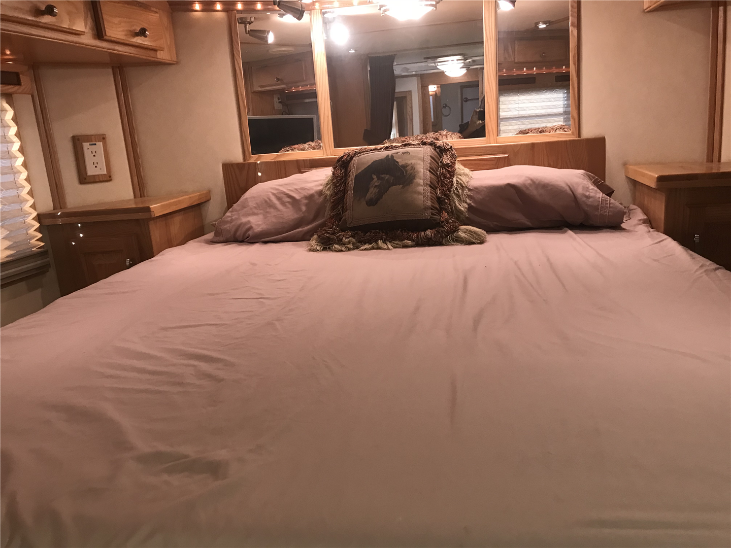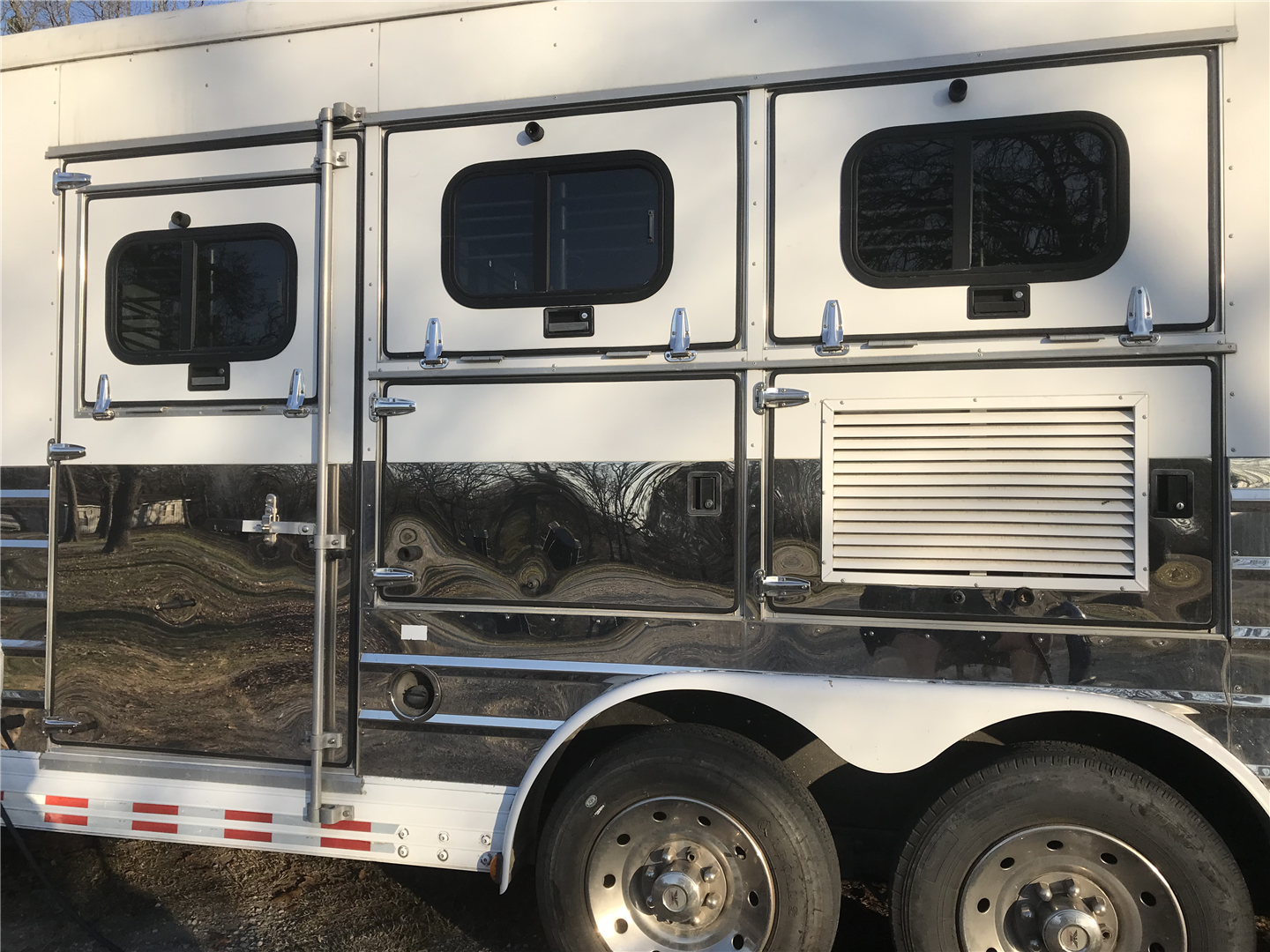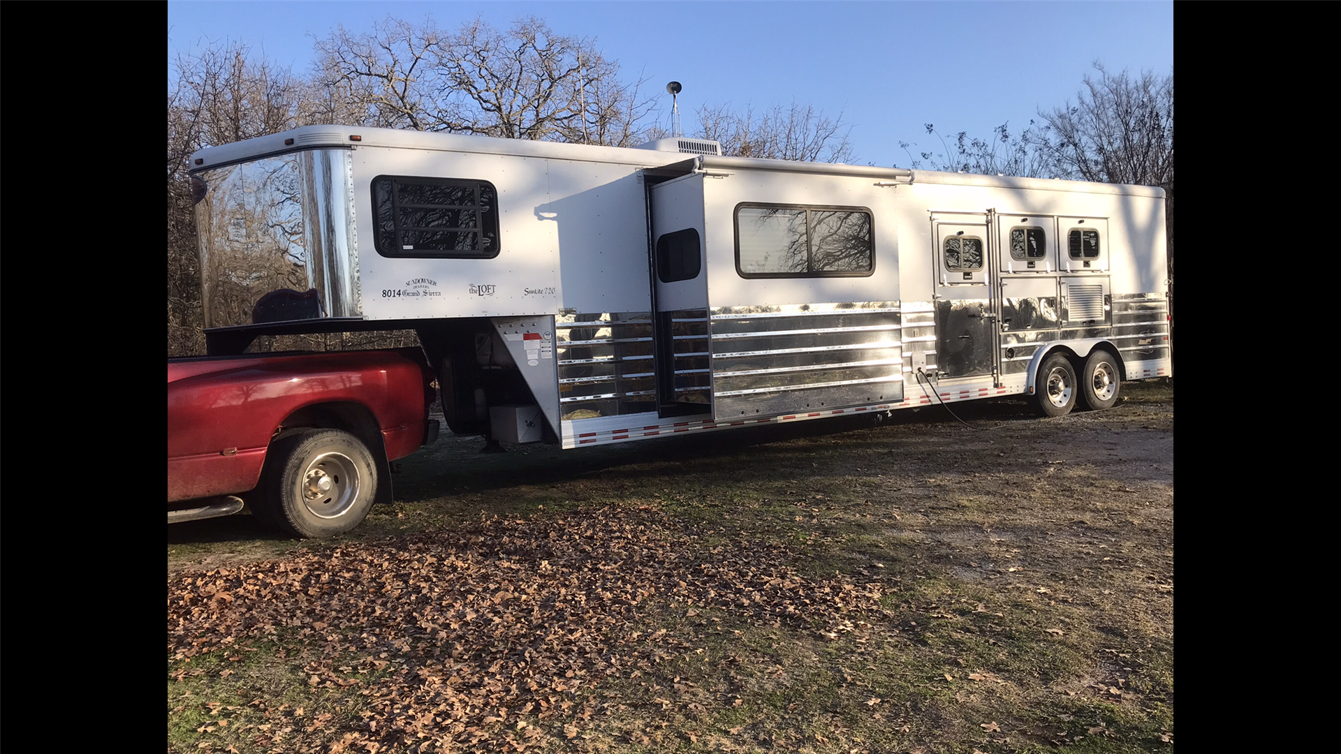 This spacious LQ trailer sleeps 4. It features a sofa with a full size hide-a-bed in the hydraulic 6' slide. Lots of storage! The hard wood cabinetry throughout includes a closet for hanging clothes with drawers in the main area and another hanging clothes closet with storage in the bathroom. The kitchen has double sinks (with a solid cover that sits flush with the counter), 2 burner propane stove (with a solid cover that sits flush with the counter), vent-a-hood & light, microwave, large refrigerator and freezer, more cabinets for storage in the kitchen. The bathroom in addition to the clothes and storage closet has 2 medicine cabinets, toiletry cabinet and cabinet storage below the sink and countertop, toilet, large shower with a glass enclosure and a skylight above it, a vent in the ceiling, pocket door. Walk thru door to the horse area. The bedroom area has a queen mattress, cabinet storage on both sides, privacy curtain, several lighting options. Night/ Day shades on the windows with mini blinds in the kitchen and on the door window. Ducted AC and propane furnace, onboard 4000-Watt Onan generator that can be turned on by a switch on the interior control panel or outside in the manger compartment where it resides. The extra deep electric awning is powered by the interior control panel. The trailer has hydraulic jack, exterior water hydrant, 2 LP tanks. The trailer has drop down windows on both sides, escape door, full stud divider in the first stall, 2 mangers, roof vents and rubber mats, interior lighting in the horse area and in the collapsible rear tack. The tack has a swing out saddle rack, blanket bars and net pockets on the door for tack storage, exterior lighting behind the trailer for loading/unloading and for tack. The other manger storage compartment (generator is in one) has net pockets inside the door for storage. This trailer has all of the conveniences for comfort and ease.