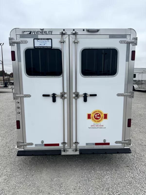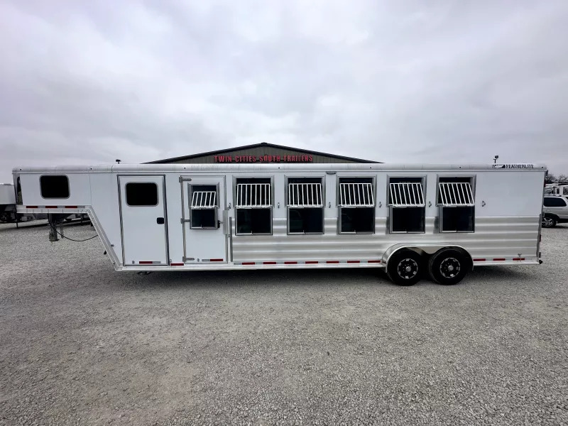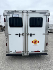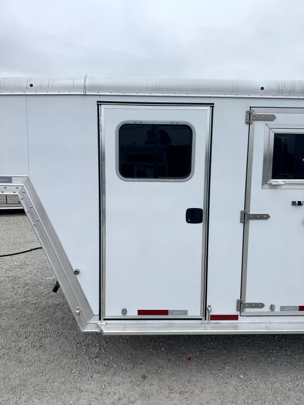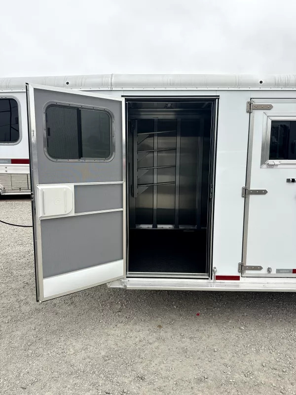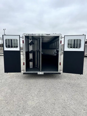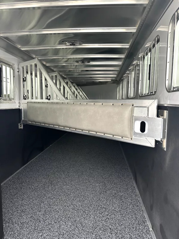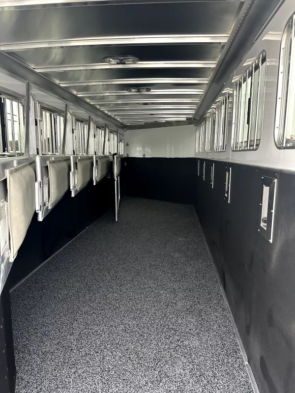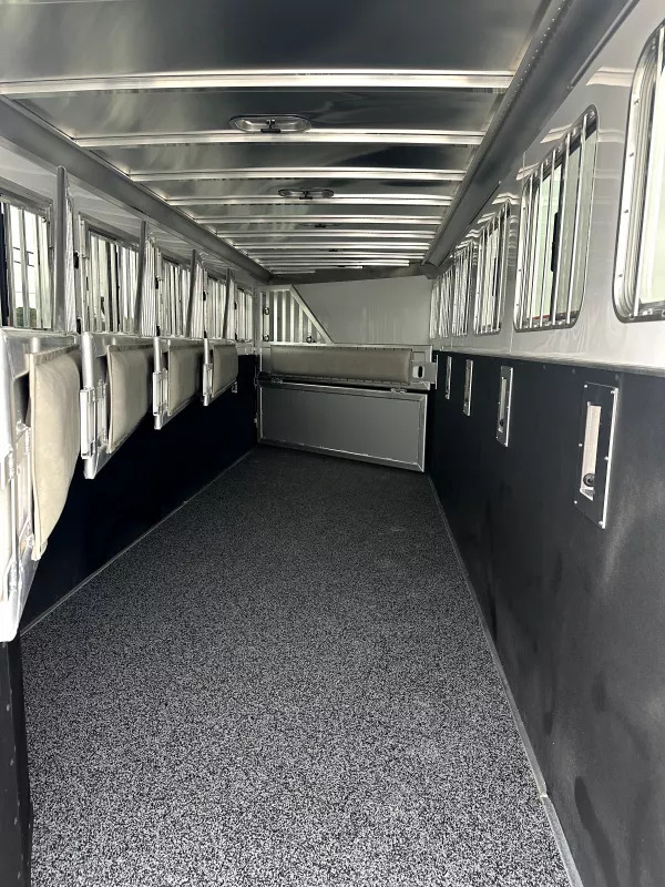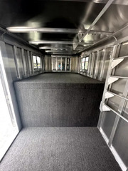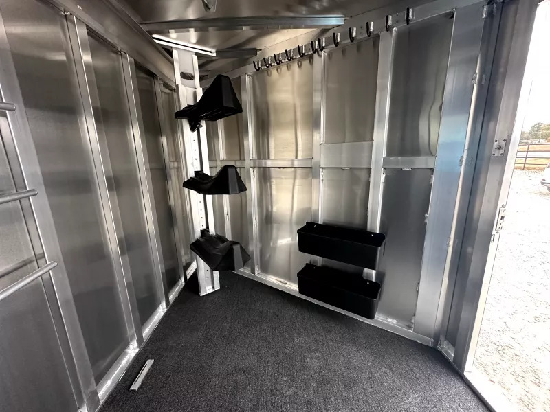 Horse Area - easy care floor, kick pads, lined and insulated walls, 6 pop-up roof vents, drop down windows w/ folding faceguards (head), sliding bus windows (hip), padded spring loaded air-flo dividers w/ slam latches, 1 stud divider, escape door, nylon butt & chest straps, 5 tie rings per stall, interior LED load lights, folding and removeable rear tack w/ 3 tier adjustable and removeable saddle rack, rear tack LED light.