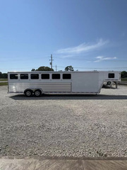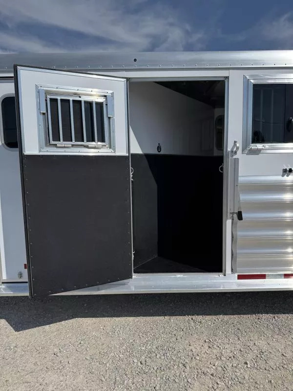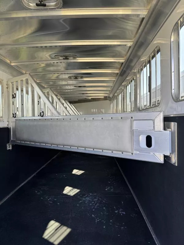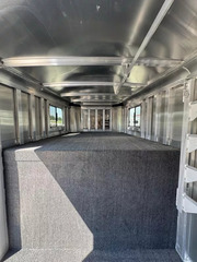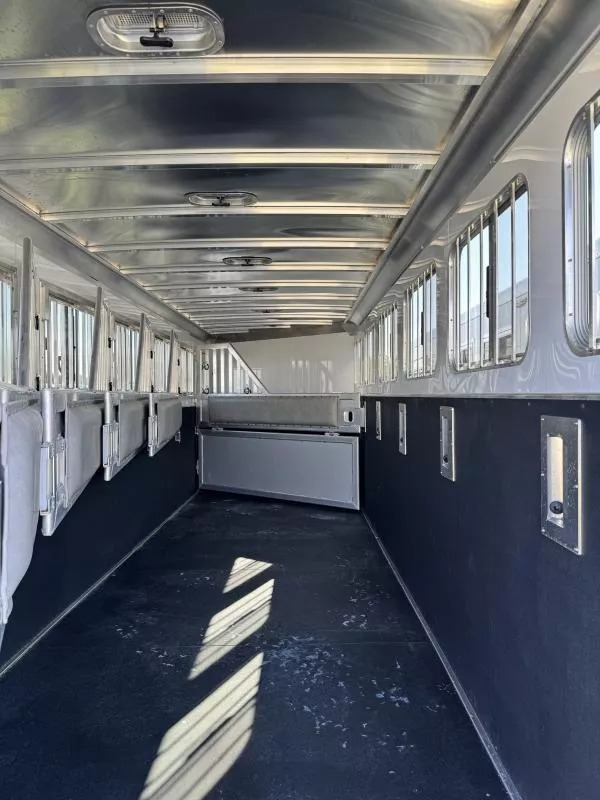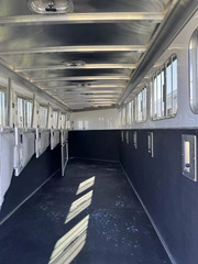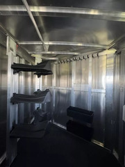 Horse area - rubber floor mats, 48” rubber lined kick pads, lined and insulated to the ceiling, first stall escape door, square drop feed door and drop faceguards on each stall (head), bus windows with slides and screens (hip), Air padded air flo dividers, first stall bottom partition, pop up roof vents, interior LED lights, inside tie rings, rear folding/removable tack, extra location for saddle rack post, halter hooks.