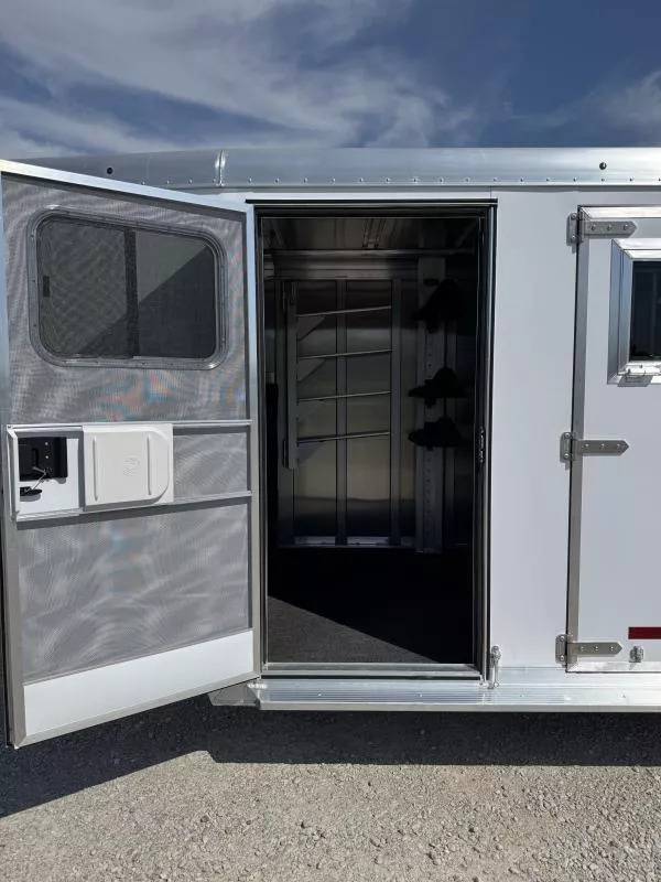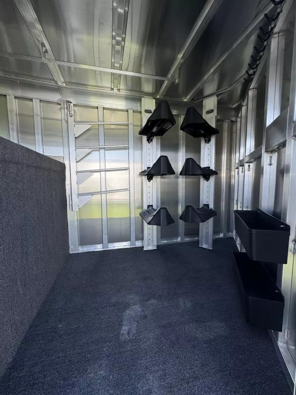 Dressing room - turf on floor, turf on drop wall and in nose, 5’ long clothes rod, brush box, halter hooks, (2) 3 tier adjustable and interchangeable saddle racks, swing out blanket bars, interior LED lights, camper style entry door, swinging screen door.