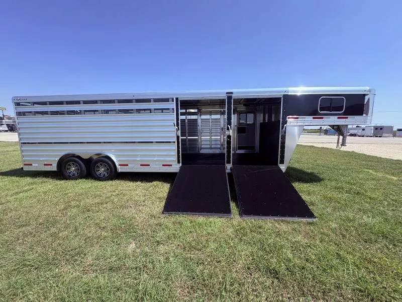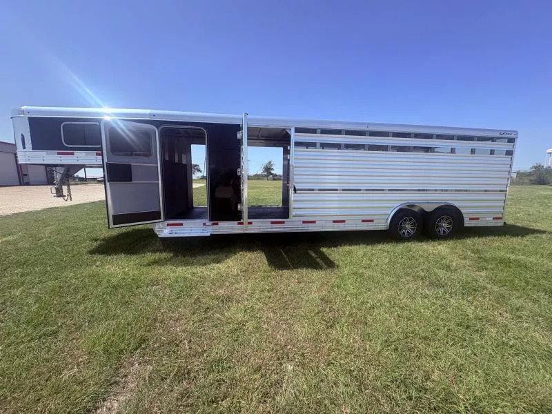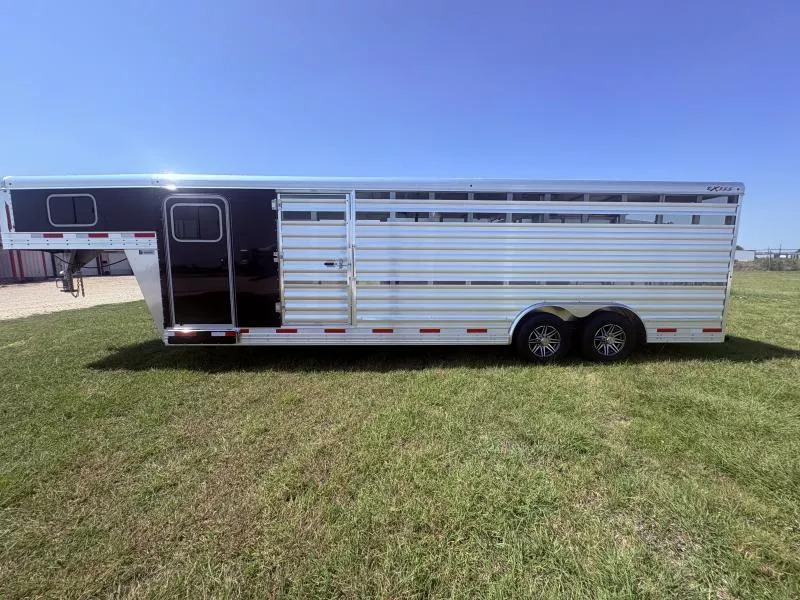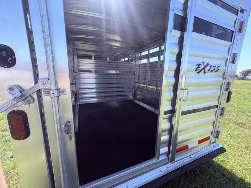 Step up your livestock hauling game with the rugged reliability and premium features of the 2026 Exiss STC 8024 Stock-Combo. Built tough for serious work, this trailer blends functionality, comfort, and premium build quality that you’ll appreciate trailer after trailer. Key Features & Specifications * Gooseneck design with an 8’-0” wide exterior. * FLOATING divider gate * Single Leg Hydraulic Jack (w/Two 12V Batteries) * GVWR 14,000 lbs with dual 7,000-lb rubber torsion axles with electric brakes. * Lightweight empty weight * Aluminum construction throughout. * Heavy-duty center gate (full swing with slider) + heavy slam latch with external release. Secure, reliable operation when sorting, separating, or loading livestock. * Loading & access aids: large full-swing rear gate (with slider & air gaps), a wide 37? escape door, teardrop fenders, and matching spare tire/rim included. * 4’ straight wall tack room Perfect for livestock owners, horse owners, ranchers, or anyone hauling mixed stock who wants a trailer that has both rugged stock hauling capability *and* the amenities for tack, gear, and safer, more efficient loading. If you haul often, over long distances, or need the extra room and durability, this trailer will serve you well for years. Call Rolling M Trailers at 512-746-2515 for more information. Financing available.
