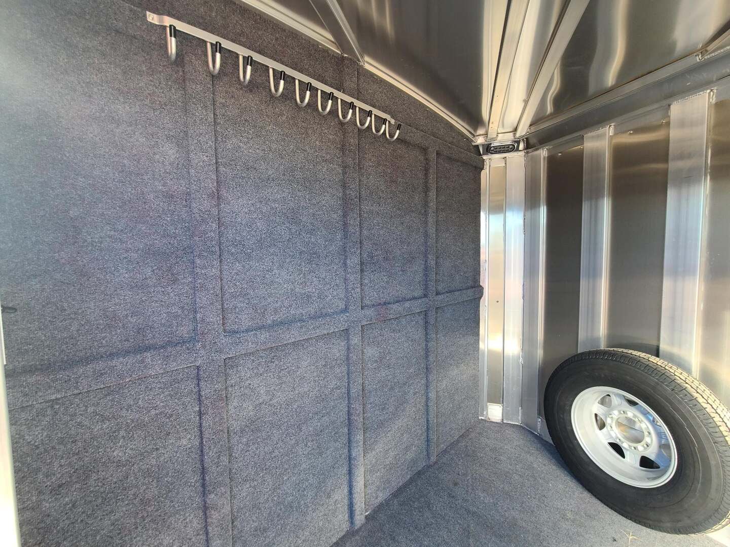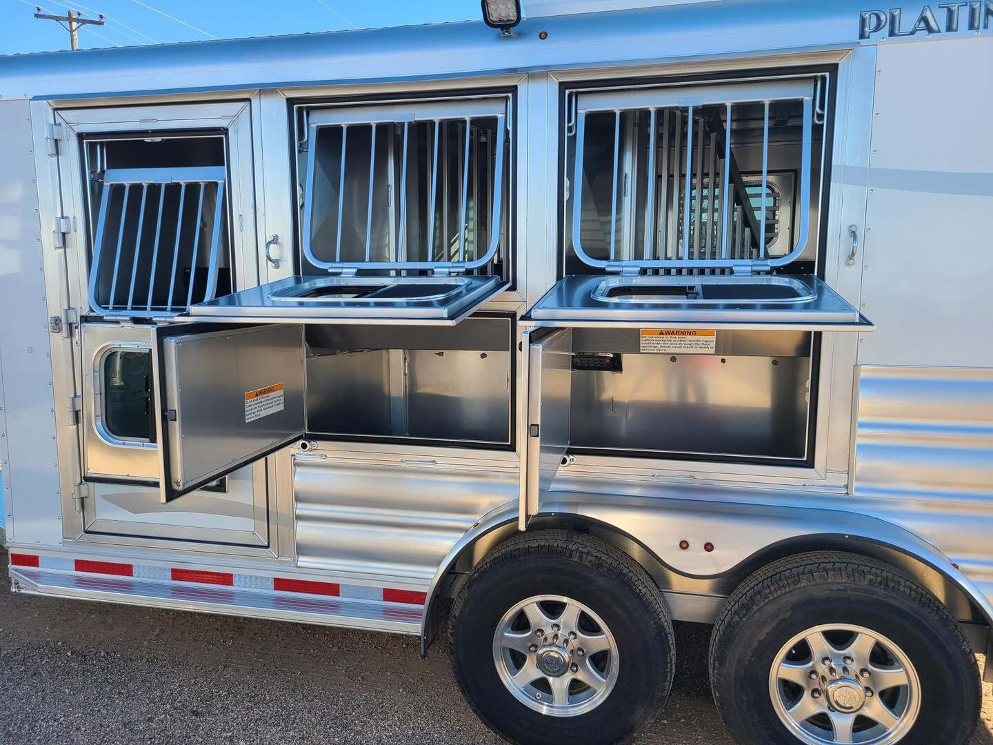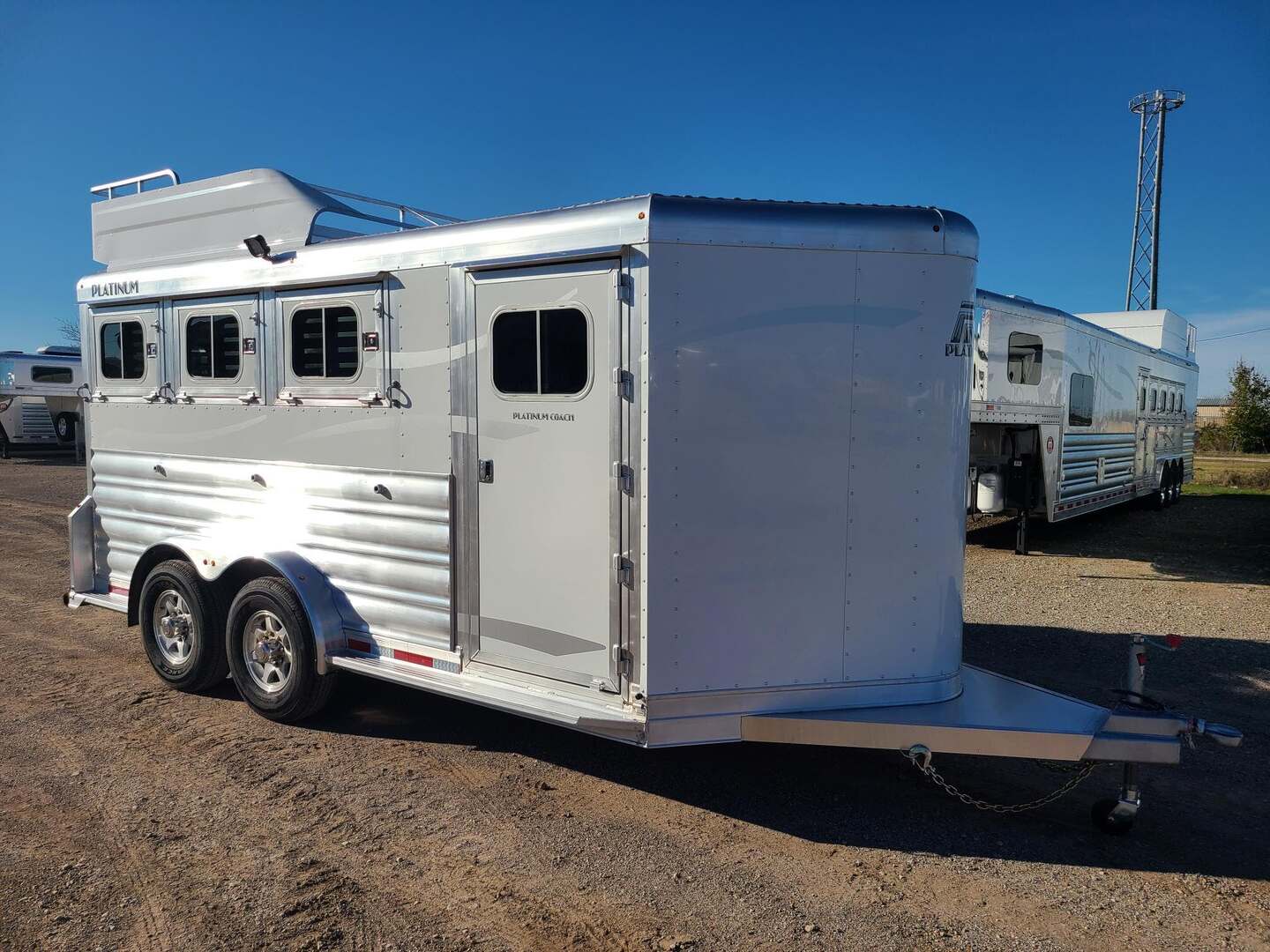 Platinum Coach 3 Horse Bumper Pull 7’6” wide 7 tall 15’ long Extended tongue to be pulled behind motorhome!! Aluminum mag wheels 6’ hay rack and ladder Two mangers with escape door on first horse Drop down windows on head/hip Drop down window bars Flow through dividers for more air flow Carpeted rear tack 3 tier swing out blanket bar Carpeted bulkhead wall with 10 bridle hooks Baby panel on first divider