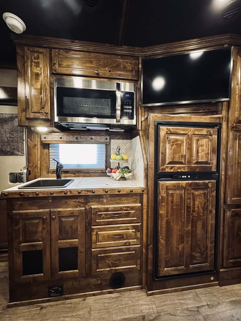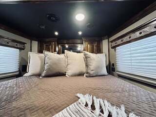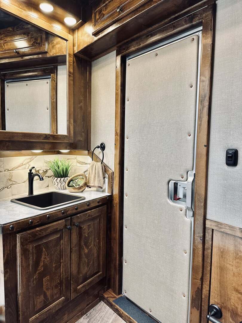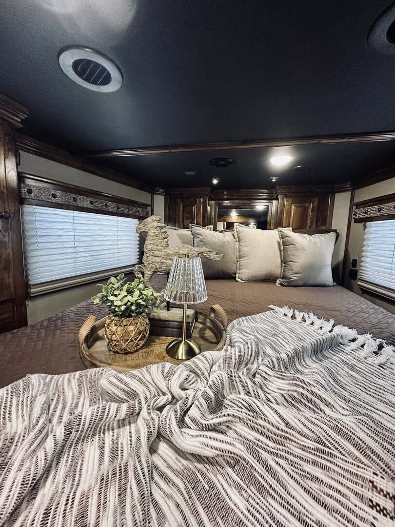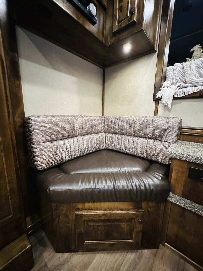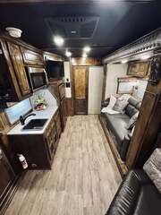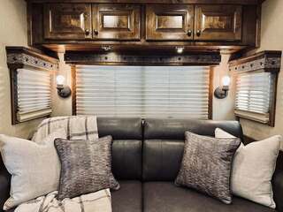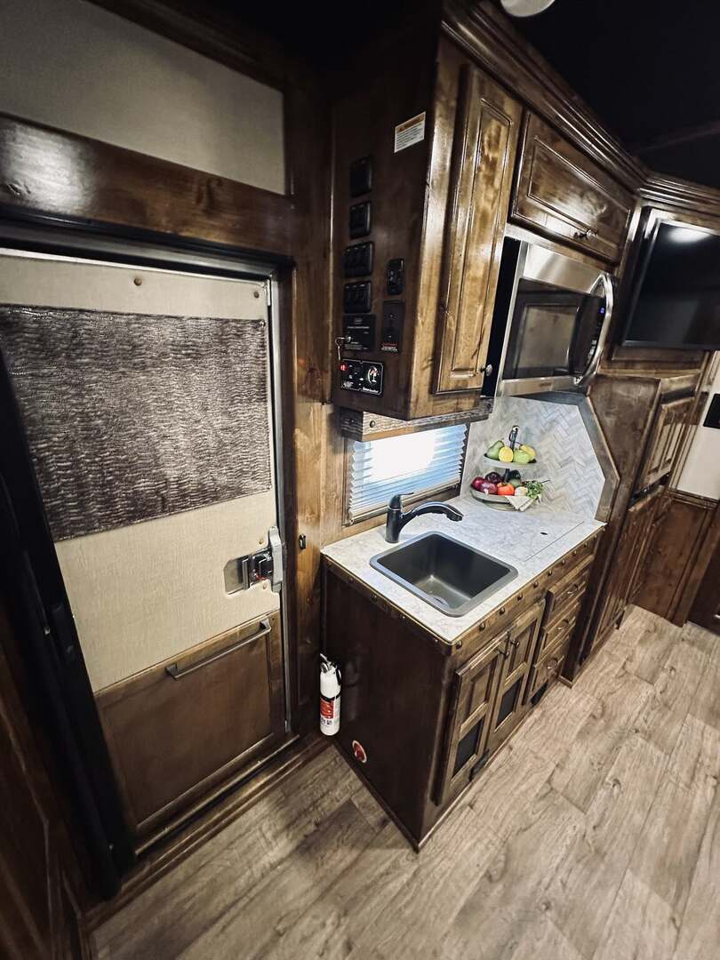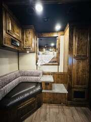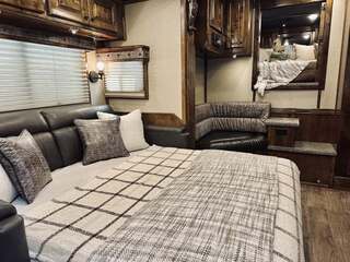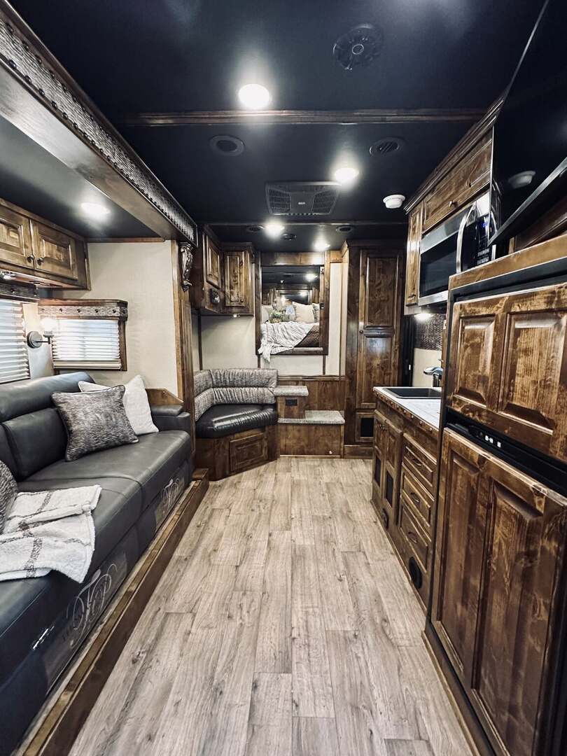 Platinum Coach 5 horse with 14”7” Short wall Outlaw Conversions interior SLIDE OUT with Tri-Fold Sofa and Corner Bench with SIDE LOAD Platinum Coach Features: 8 wide x 37’ long x 8’ tall WERM FLOORING! 70/30 Rear Doors & SIDE LOAD Shelves, bars, hooks and trays in rear tack 4 mangers with escape door at head Drop down window bars on head side Drop down windows on curb side 8’ hay pod & ladder 24” walk through door Baby panel with rubber on first divider Flow through and swing back dividers 2” Blocked axles for additional ground clearance 5 outside halogen load lights 7 tier swing out blanket bar Triple 8,000# axles 17.5” aluminum wheels & 18 ply tires Outlaw Conversion Features: 14’7” short wall 70” tri-fold sofa Corner bench next to slide out 32” SMART TV’S.....WiFi!!!!!!!!!!! Dual-Hydraulic Jacks Dark Knotty Alder raised panel cabinetry Floor and corner cabinetry in nose Onan 4.0 MicroQuiet generator 15,000 BTU A/C & HEAT PUMP 20,000 BTU furnace Electric power awning...NICE!!! TILE BACKSPLASH IN KITCHEN!! 6 gallon hot water heater with Propane heat 40 gallon water tank AM/FM/CD/DVD player with 2 interior and 2 exterior speakers TWO 32” SMART LED flat screens on arm Deep quartz sinks in kitchen and bathroom 2 Hardwood hat racks over R/V door 6.0 refrigerator Recessed 2 Burner cooktop Convection oven with vent hood Extra wide pocket door to bathroom with mirror on bathroom side 32” radius shower w/ bronze glass door & skylight Porcelain toilet with foot flush