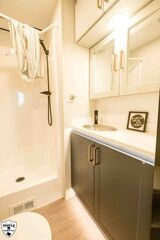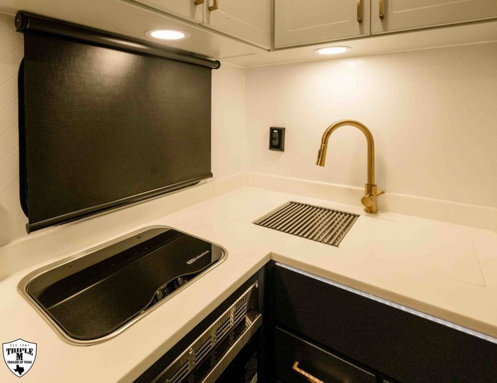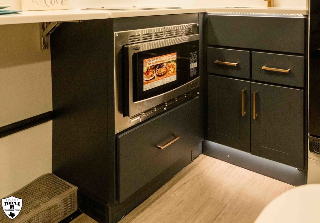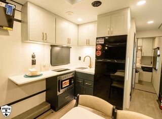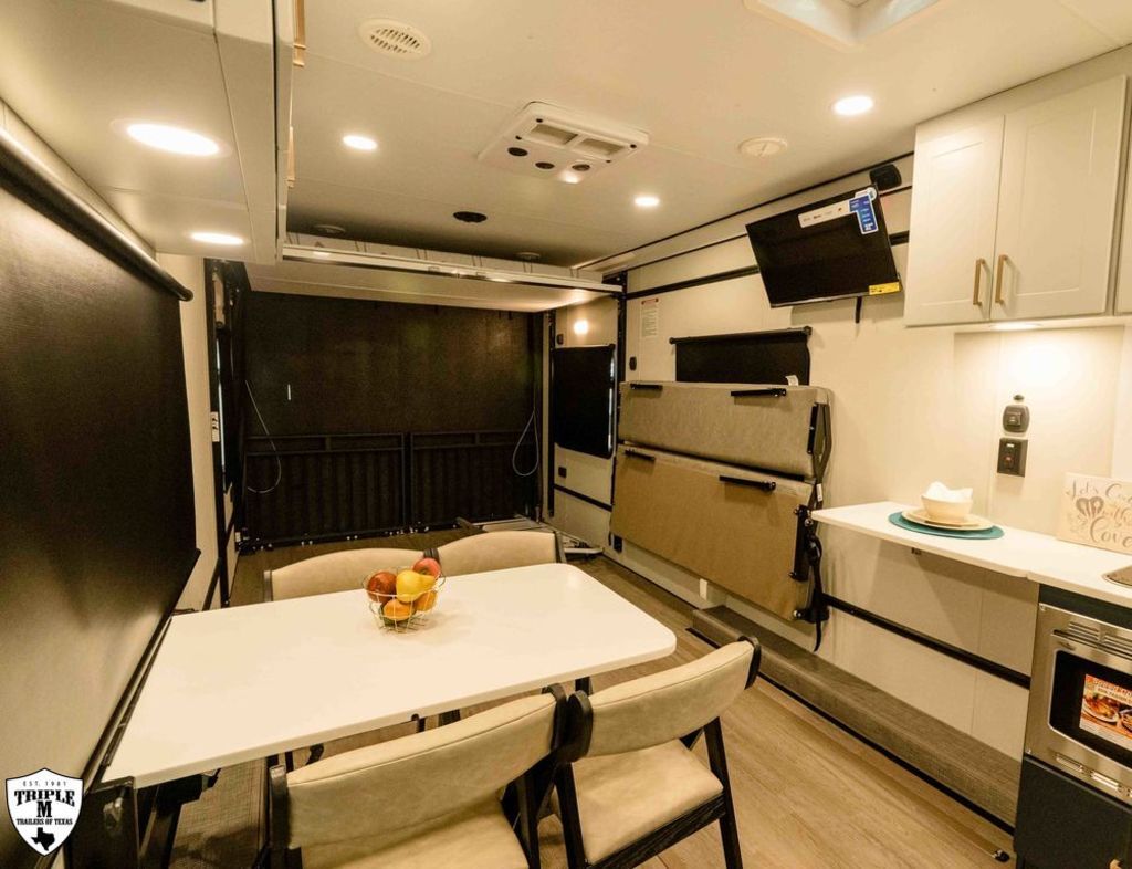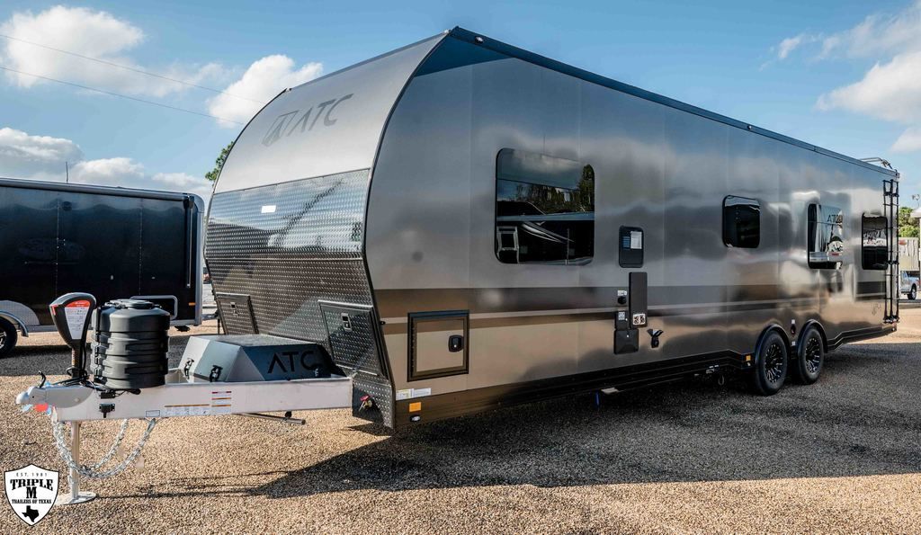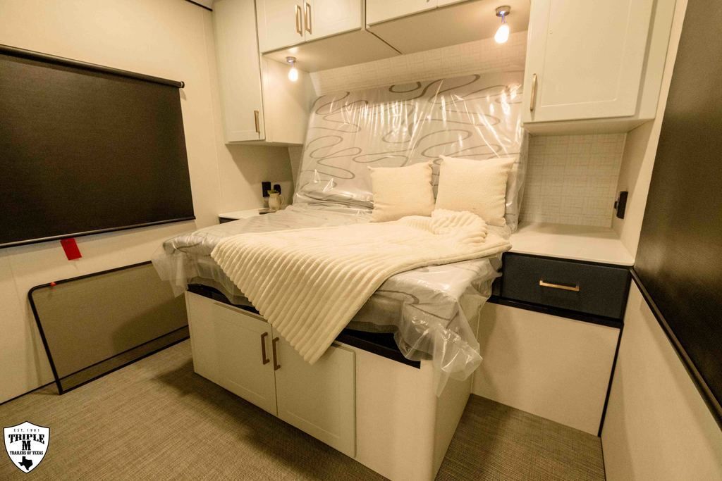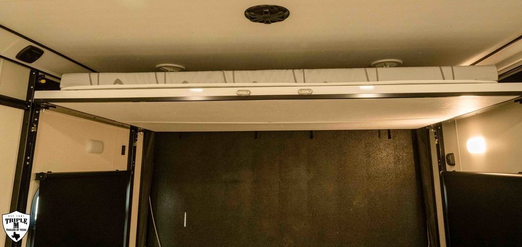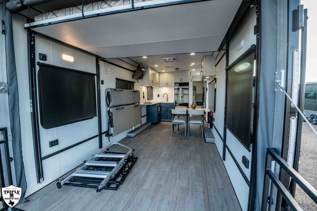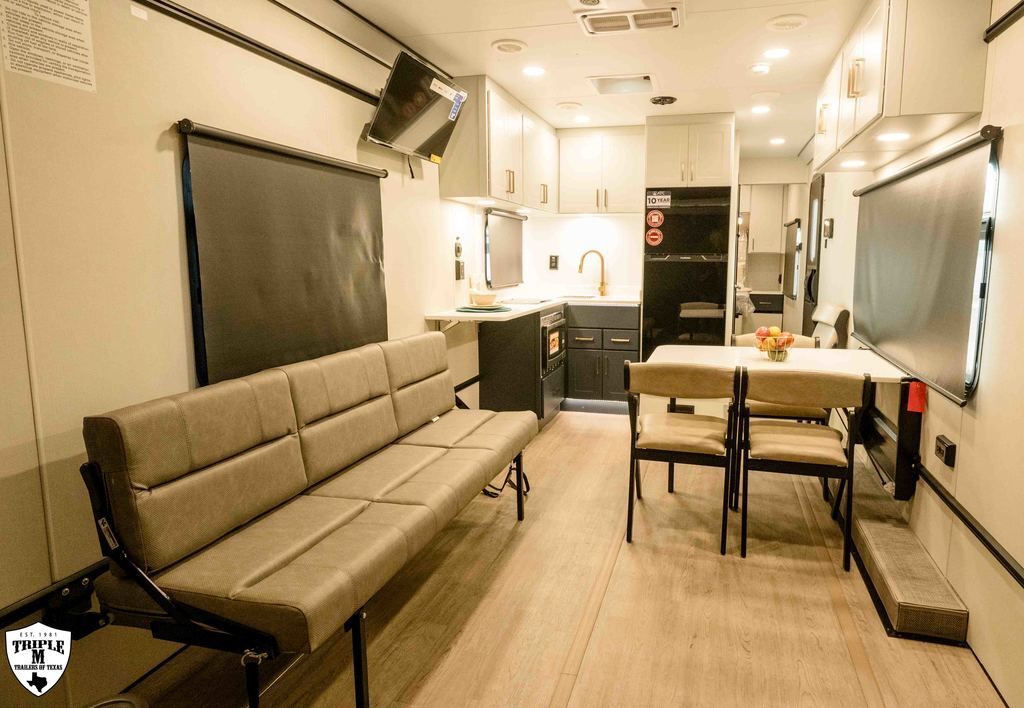 PLa 550-3217 32’ FLOOR / 38’ OVERALL 8’6 WIDE / 7’6 TALL Cableless Rear Ramp Door Spoiler with Loading Lights LifeTrac Modular Component System Tie Downs (3) Rows of Airline Tracks with Covers Exterior Pass Through Storage Electric Tongue Jack Electric Scissor Jacks Aluminum Rims/Maxxis Tires Spare Tire Steel Rim Bogey Wheels Backup Camera Prep (2) Scene Lights (Curbside) Fold Out Adjustable Step Power Awning with Light Strip TV Prep Exterior HD Digital TV Antenna with Wifi Router Energy Package 1000 with Lithium Battery Touchscreen User Control Panel Dimmable Can Ceiling Lights Smart TV 32” (12V) Entry Door with Tinted Window and Screen Door Frameless Dual Pane Windows with Shades and Screens Composite with Commercial Grade Vinyl Floor Stereo with Interior and Exterior Speakers Aluminum Cabinets with Solid Surface Countertops Dinette Table with 4 Folding Chairs Refrigerator (12V) 10 cu ft Convection Microwave LP 2 Burner Cooktop Aluminum Cabinets with Solid Surface Countertops TV Prep in Bedroom Residential Queen Bed with Storage Tilt Bed/Sofa Aluminum Cabinets with Solid Surface Countertops Porcelain Toilet Shower 28” x 36” with Curtain Heating and Cooling (2) 15K BTU A/C 24K BTU Furnace (2) Roof Vents / 12V with Remote City Water Hookup with Fill 100 Gallon Fresh Water Tank 45 Gallon Gray Tank 45 Gallon Waste Tank with Flush 6 Gallon Water Heater (LP Gas/Electric) Heat Pads/Tape on Tanks and Water Lines Exterior Water Spigot (2) 20lbs LP Tanks with Quick Connect Generator Prep Premier Package Exterior Shower Generator and Fuel Fill Station w/ 36 Gallon Tank Sofa Sleeper 6’ (Grey) HAPPIJAC Bed ENERGY PACKAGE 3000 800 Watts Solar 3,000 Watt Inverter 60 Amp Charge Controller 540 Amp Hours Heated Lithium Battleborn Battery Cabinets = Nautical Blue A/C Upgrade w/ Heat Pump Exterior Ladder Above and Beyond with All Weather Package (Included) 6 Sided Welded Aluminum Frame Torsion Axles 1 Piece Aluminum Roof Composite Ramp Door Composite Flooring and Wall Panels Enclosed Underbelly Insulation: Wall (R7), Floor (R6), and Ceiling (R11) 50 Amp Distribution Panel with 12V Converter 120V/USB Power Outlets REAR RAMP MEDIUM CHARCOAL SKIN LINEN BEIGE INTERIOR VENATO SPARKLE COUNTERTOP BLACK EXTERIOR TRIM GRAPHICS EMPTY = 9,285 GVWR = 13,200